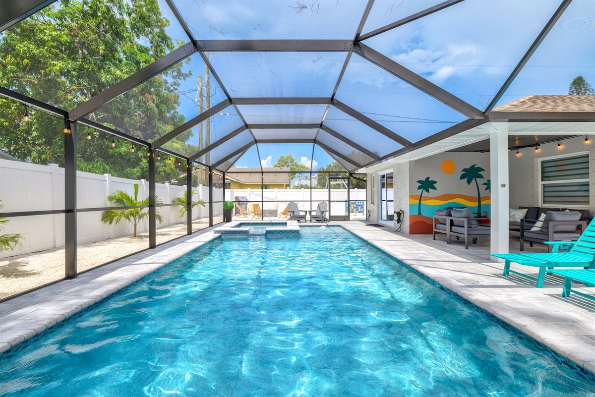Nyt Florida-solen i et fantastisk, nyrenovert 4/2 basseng-hjem! Vi har sørget for nesten alt vi kunne tenke oss, inkludert fem 4k-TV-er med Netflix og kabel-TV, trådløst nettverk, oppvarmet (valgfritt) saltvannsbasseng med 7' privat gjerde, sykler for voksne, strandutstyr, Pack & Play, kontor, brettspill, avslappende lenestoler, fylt kjøkken, vaskemaskin og tørketrommel, garasjeparkering, hundekasse, alt i et rolig og trygt nabolag. Og selvfølgelig er det bare 5 miles til verdenskjente strender.