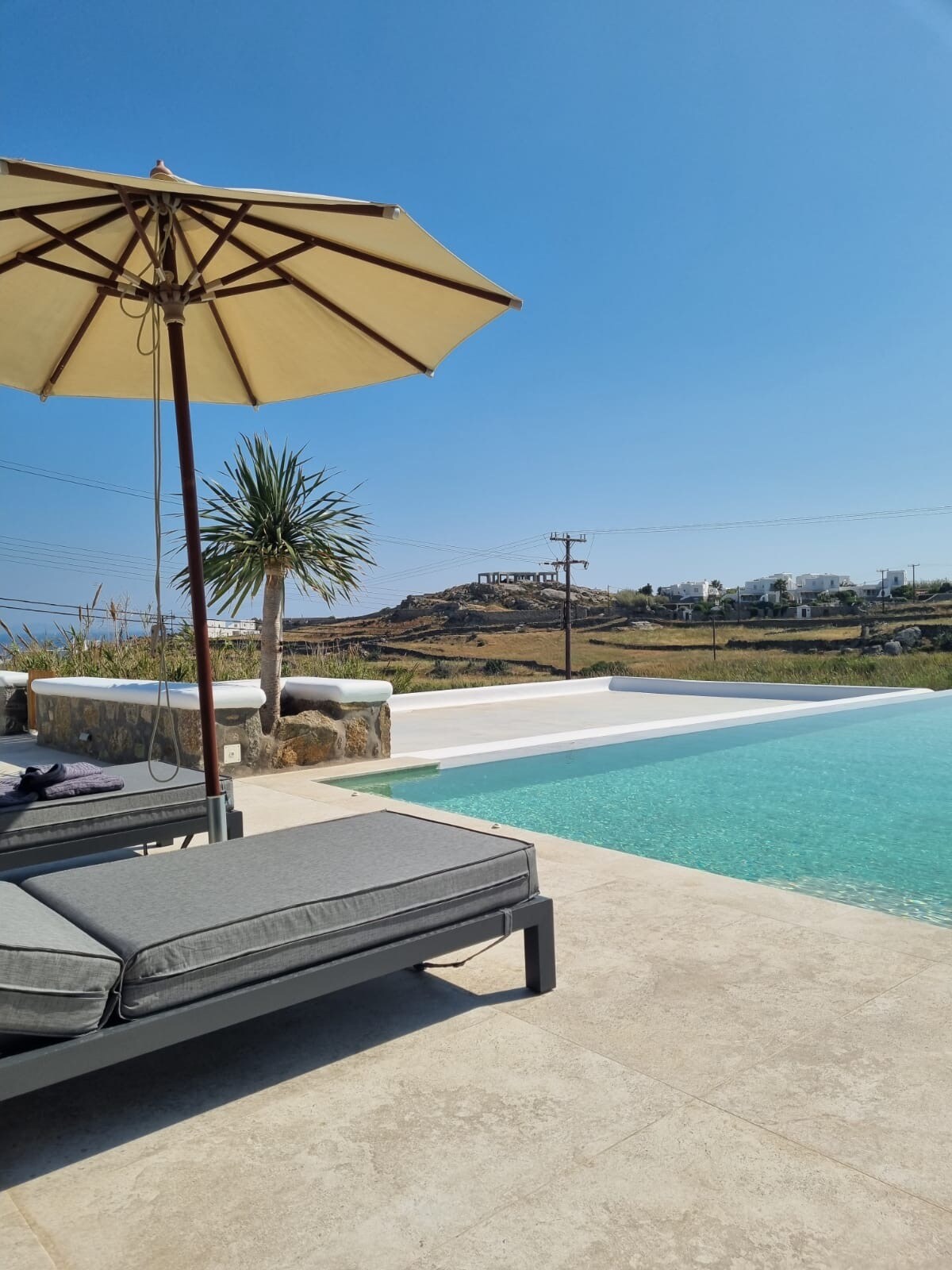 Olive Mykonos Villas - er et nytt hotell som ligger i Ano Mera, Mykonos, i nærheten av stranden Elia og Agrari. Junior Villa har en kingsize-seng laget av en berømt italiensk designer og en sofa som blir en singe-seng , et bad laget av avrettingslag med dusjhytte og vaskekum av stein. Dette rommet er på 30 kvadratmeter og passer for det meste for korte opphold. Verandaen gir et fredelig sted og avslappende øyeblikk. Passer for opptil tre personer.