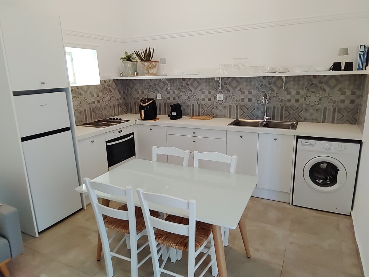Fully equipped one-bedroom apartment with frontal sea view. One double bed in the bedroom, fully equipped kitchen (oven, fridge-freezer, dishwasher, 4-pits), bathroom with shower , washing machine, private terrace with chairs and table. Access to a shared patio with direct access to the sea (rocks) where the guests can take a morning swim. Frontal sea view from living and bedroom. A few steps from the center of Ermoupolis.