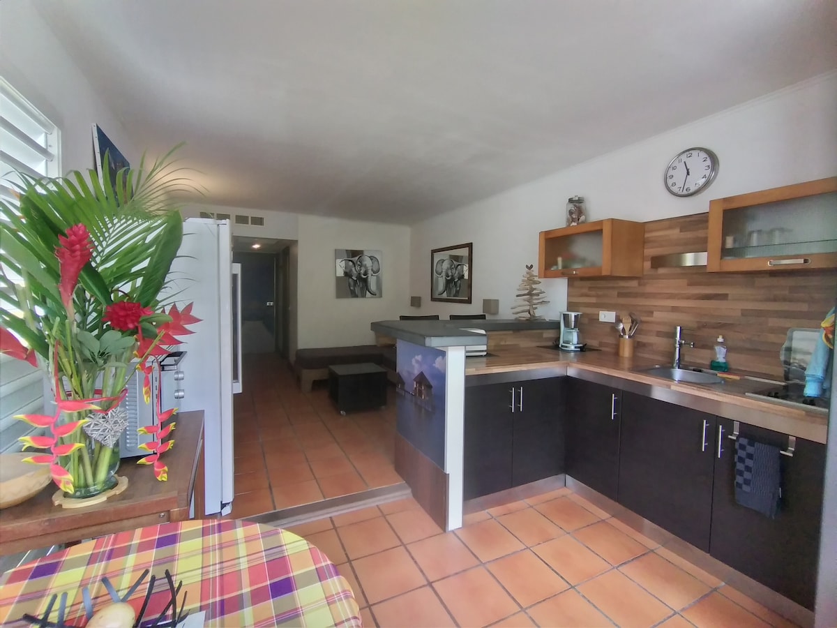 4-personers studioleilighet ligger i Aki-bygningen i første etasje, med vakker havutsikt. Innkvarteringen er ideelt plassert i nærheten av stranden og ganske nærme aktivitetene uten å bli forstyrret. Mulighet for å ha en video per enkel forespørsel. Nettstedet inkluderer to svømmebassenger, inkludert en på 700 m2 med et padlebasseng på 50 m2. To vakre strender med bar / restauranter for å smake kreolske spesialiteter eller slukke tørsten mens du nyter stranden og har en fantastisk avslappende tid.