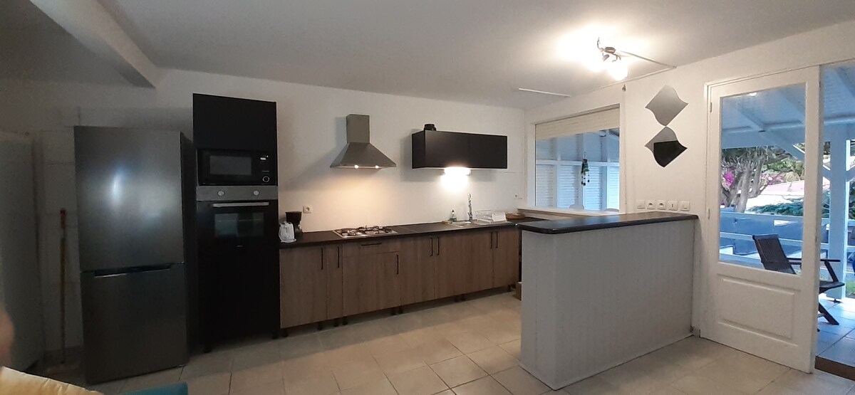 Fantastisk villa (180m²) med stor hage og privat strand, nær alle fasiliteter, ideelt plassert i Sainte-Anne (Grande-Terre), der vannsport og turistaktiviteter møtes (marked, håndverkslandsby, fergehavn, Kytesurf). Perfekt for familie eller venner, 8-10 personer. 10 minutter å gå fra landsbyen Sainte-Anne og dermed fra en av de vakreste strendene i Guadeloupe med et klart og rolig hav som er helt tilpasset både små og store barn.