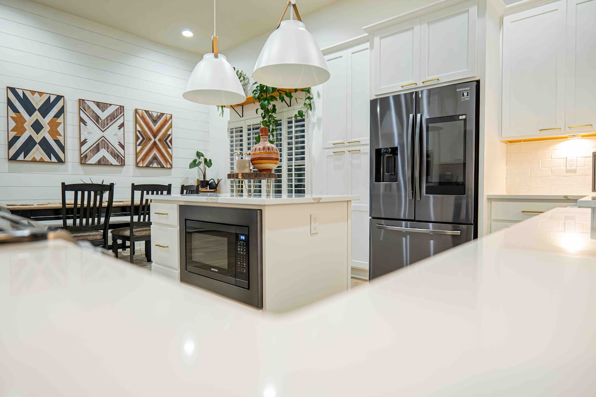 Vakkert hjem med fire senger og to bad i et fredelig og rolig nabolag. Plass til opptil ti personer. Hovedsoverommet har en king-size Tempur-Pedic-seng og en 65 tommers TV, tre gjestesoverom alle med queen-size senger, 85 tommers TV i stuen med stor seksjonssofa, bakgården har gressmatte, Weber gassgrill og bålplass, fullt kjøkken med fylt kaffebar (Nespresso, 12 kopper Breville kaffekanne og Keurig). Minutter til sykehus, shopping, uteliv, restauranter og mer! Passer for profesjonelle, familier eller grupper.