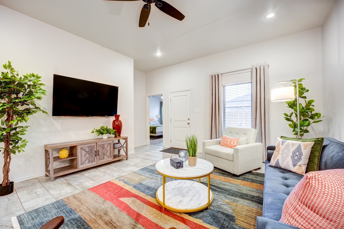 Bo i vårt nybygde, vakre Lubbock-hjem. Praktisk tilgang til Texas Tech, fantastiske restauranter og det medisinske distriktet. Alt er friskt og nytt! Nyt det åpne kjøkkenet med apparater i rustfritt stål. Sov komfortabelt i Master King-suiten eller Queen-soverommet med tilstøtende bad og slapp av mens du ser på våre 55" Smart-TV-er. Nyt å samles i vårt åpne oppholdsrom for å lage mat, spise og slappe av. Dette komfortable området har en 65" smart-TV og plass til tre personer til.