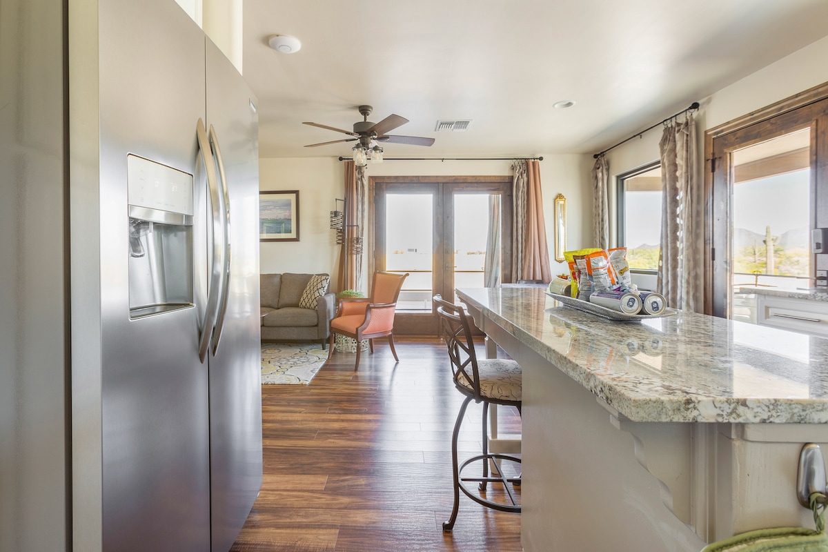 Velkommen til det vakre hjemmet vårt i Gold Canyon i Arizona! Denne fantastiske eiendommen har et privat basseng og alt du trenger for en uforglemmelig ferie. Når du går inn, blir du møtt av en romslig og vakkert dekorert stue, perfekt for å slappe av etter en dag med utforskning av de vakre omgivelsene. Stuen har komfortable sitteplasser og en stor TV, perfekt for filmkvelder med familien. Nær Superstition Mountains og topp golfing rundt Dinosaur Mountain.