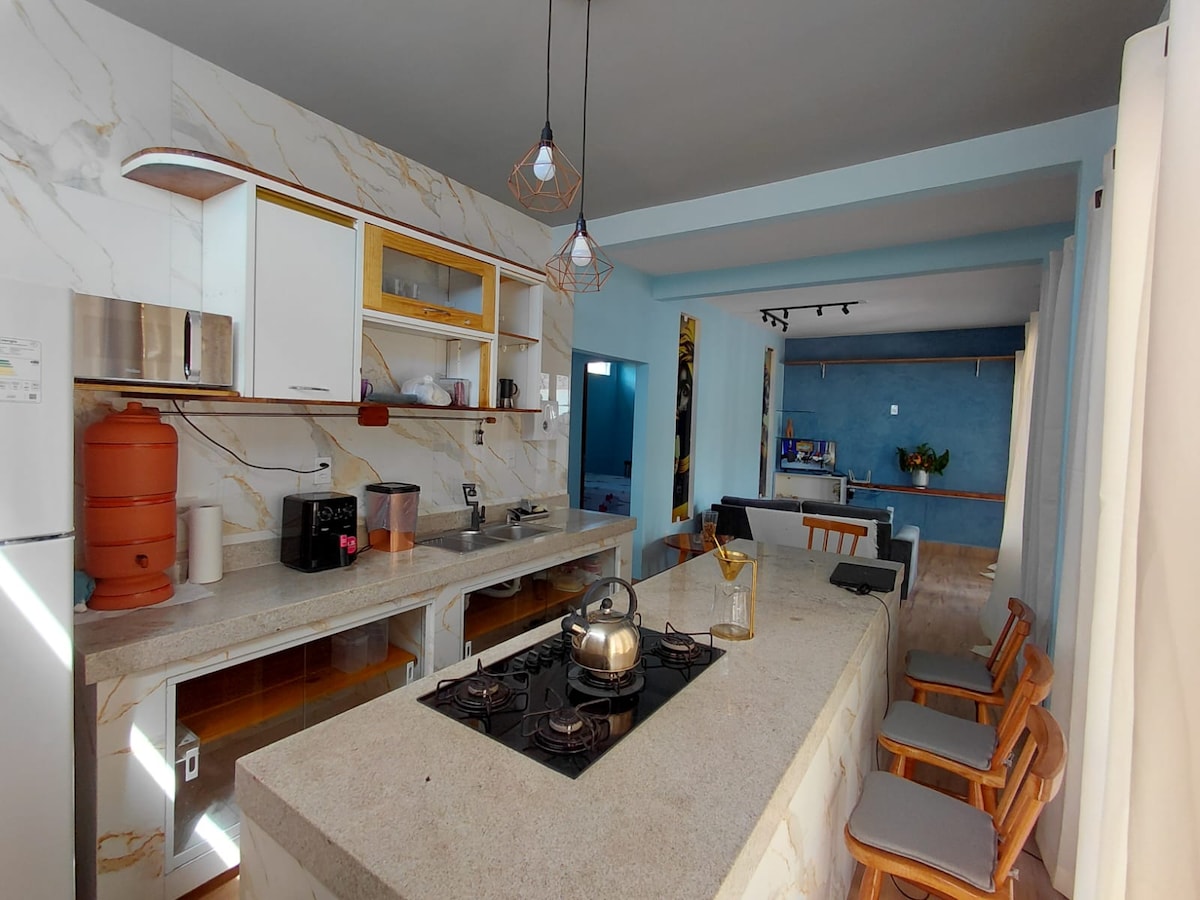 Sjarmerende og superutstyrt hus på Sítio do Conde-BA, bare 200 meter fra stranden. Den har fire rom med klimaanlegg (to suiter), komplett avhengighet, svømmebasseng med sklie og jacuzzi, grill, basseng, bordtennis og trehus med sklie og zipline – garantert moro for barn! Rustikk dekorasjon med komfort og stil, nær pizzeriaer og supermarked. Familievennlig 🌴