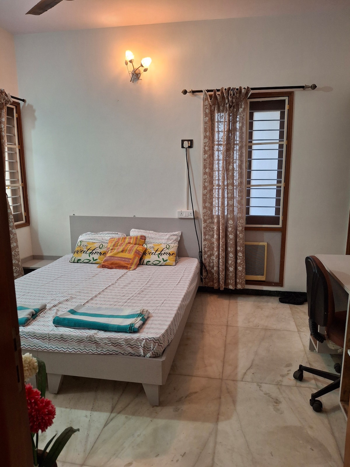 Moderne boho-leilighet | Minutter fra North Goas strender. Et koselig, fullt møblert 1BHK-tilfluktssted i første etasje som er perfekt for par, venner eller små familier. Høydepunkter: – Stilig boho-interiør med en varm atmosfære. – Klimaanlegg på soverommet og i stuen for komfort. – Smart-TV + høyhastighets trådløst nettverk. – utstyrt kjøkken med RO-vann, kokeplate, kjøleskap og vaskemaskin – delt svømmebasseng (kl. 09.00–18.00 | badetøy obligatorisk) – Et treningssenter på stedet er tilgjengelig til INR 200 per person per dag. - Døgnåpen vakthold - Gratis parkering.