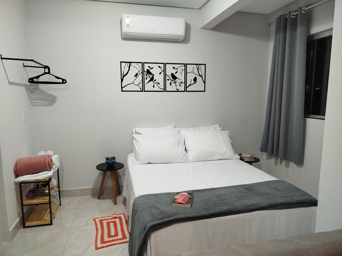 Moderne studio på 45 kvm øverst i SETOR BUENO, på T-37 med T-63. Nær Mater Dei HOSPITAL, Vaca Brava PARK, Goiânia SHOPPING og ORION medisinske senter, ideelt for fritid, konsultasjoner, eksamener eller arbeid. Regionen har Pão de Açúcar, Oba Hortifr, markeder, apoteker, kaffebarer og et bredt utvalg av MAT. Stedet tilbyr en QUEEN-seng, en ekstra seng, klimaanlegg, rask trådløs nettverkstilkobling, en smart-TV og et utstyrt KJØKKEN, noe som sikrer et komfortabelt, funksjonelt og koselig opphold, perfekt for ulike behov.