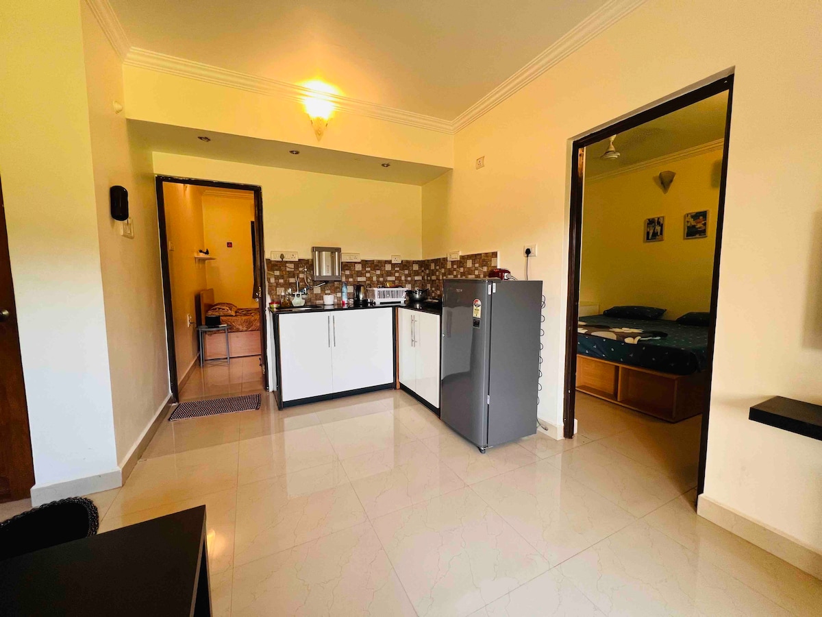 . 🌴 Sundowner: Din fredelige flukt i Goa 🌅 Bo i en massiv 1BHK kingsize-seng + sovesofa, med stor balkong bare minutter fra Candolim-stranden. Med to klimaanlegg, raskt trådløst nettverk, strømforsyning, et fylt kjøkken, balkong og åpen parkering møter komfort boho-sjarm. Butikker, kafeer og uteliv ligger i nærheten for ultimat bekvemmelighet. Innsjekking kl. 12.00, utsjekking kl. 11.00. ID kreves, maks fire gjester Merk- Såper og vannflasker som skal bæres av gjesten.