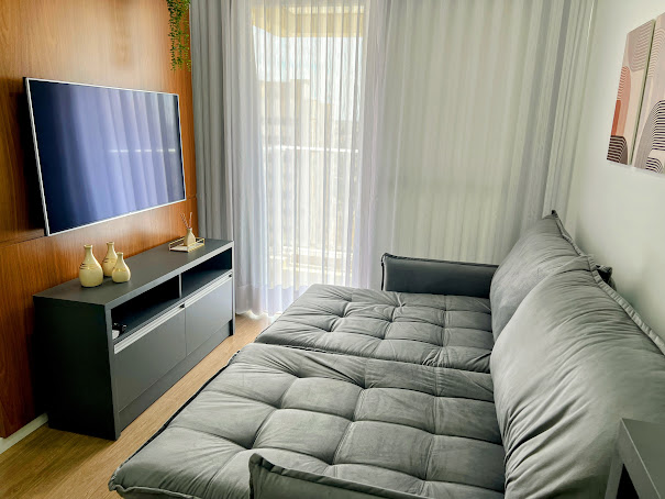 77 m² privat leilighet for din familie og luft i alle rom i et rolig og trygt nabolag. Det er 3 soverom og 2 bad: 1 er en suite med en queensize-seng av utmerket kvalitet; 1 soverom med dobbeltseng; 1 hjemmekontor med en queensize-seng som blir til 2 enkeltsenger. Det er også aircondition i stuen (18 000 BTU). Planlagt og komplett kjøkken, fiber wi-fi, smart-TV og netflix. Garasjen er dekket og ligger inne i leilighetskomplekset. Det er barneområde i leilighetskomplekset og bassenget er gratis for barn. 24-timers portvakt.