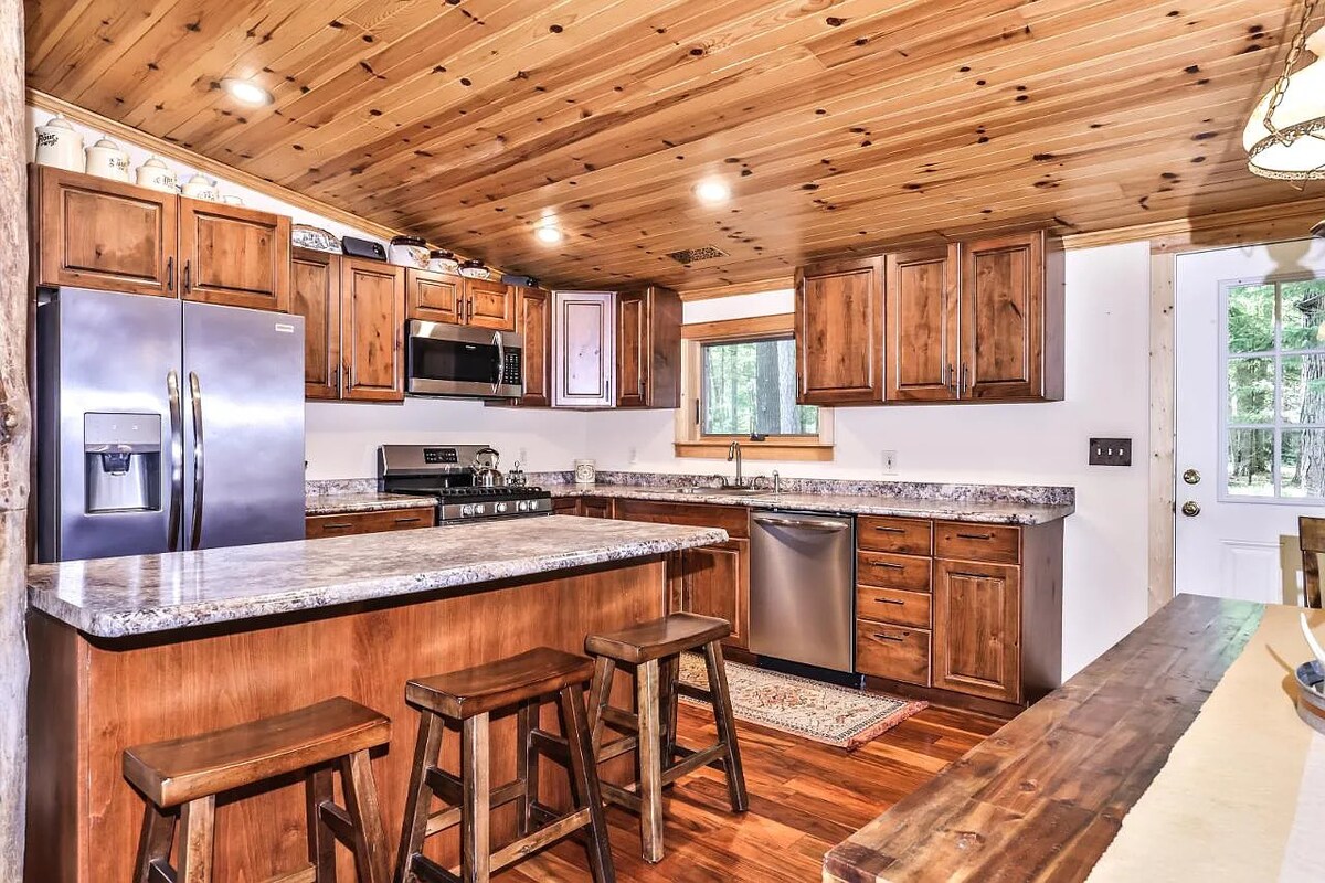 Koselig hjem med varm belysning og malingsfarger og kreativ Northwoods-dekorasjon med et moderne preg. Fasilitetene inkluderer høyhastighets internett, rustfrie apparater, kaffetrakter, vaskemaskin og tørketrommel, strømmetjenester/Apple TV, tre flatskjerm-TV-er, to peiser, sentral klimaanlegg og en høyeffektiv ovn. Hjemmet ligger på 4 skogkledde hektar (ikke ved innsjøen) utenfor en velholdt grusvei. Svært privat. Ingen naboer i sikte. Det er rikelig med dyreliv. Hunder er OK med godkjenning og gebyr.