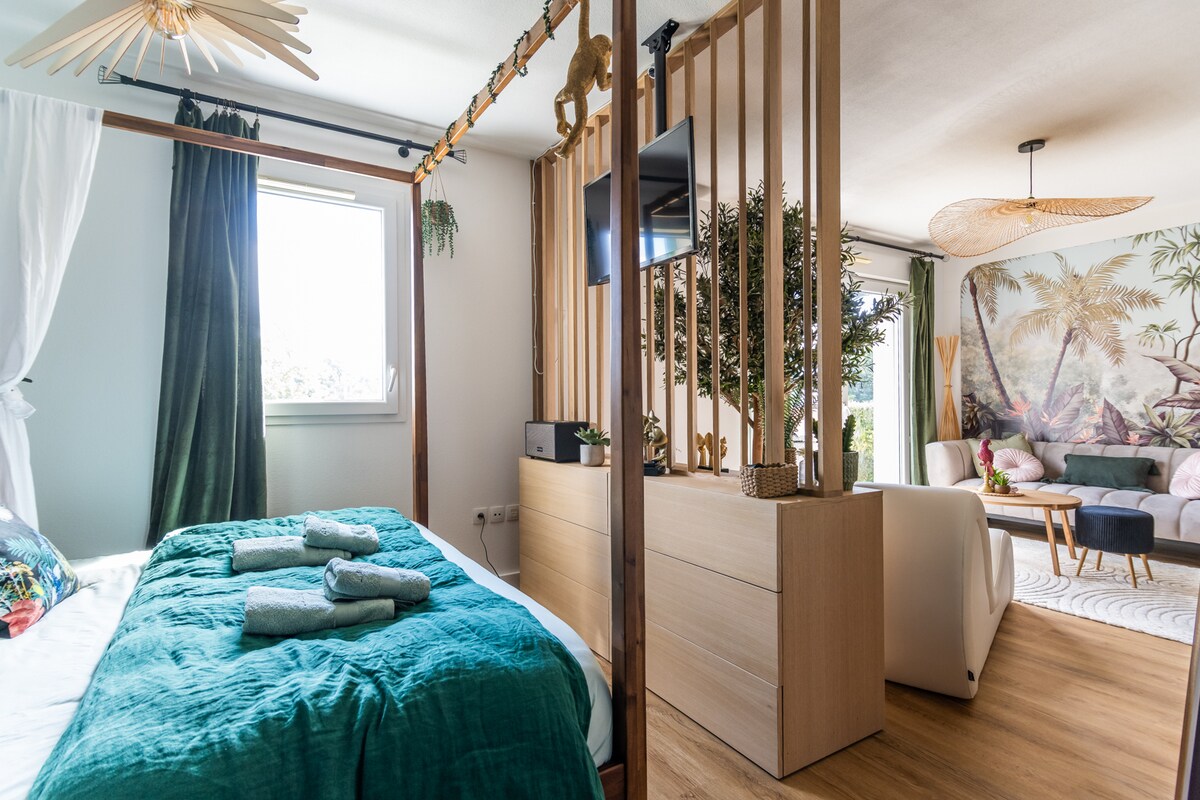Uavhengig bolig med kjøkkenkrok, bad og toalett. Trikk linje C 100 m unna, direkte tilgang til jernbanestasjonen (6 min), Bordeaux sentrum (10 min), Matmut stadion i Bordeaux (1 t). Arkea arena (45 min). Tilgang til hage. Utstyrt med kjøleskap + mikrobølgeovn, Senseo kaffemaskin, vannkoker, kjøkkenkrok. Mulighet for å parkere sykler eller motorsykler i hagen.