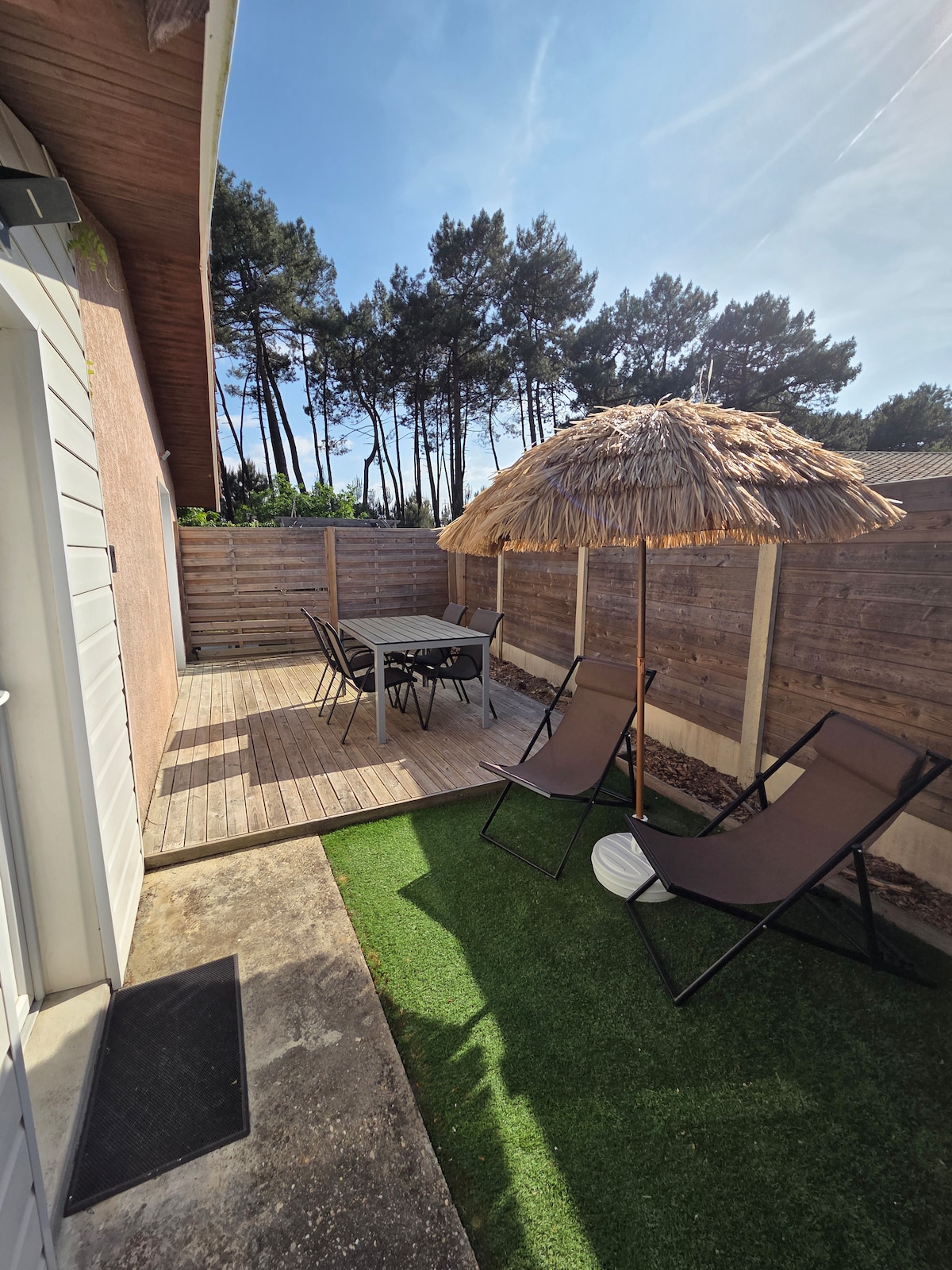 I utkanten av skogen, nær sykkelveien som fører til innsjøen og havet. Nær supermarked, bakeri ... 500 m Sjarmerende bolig med ett soverom (en seng for 2 pers.) tilstøtende bad, spiseplass med kjøkkenkrok (kjøleskap, kokeplater og mikrobølgeovn), stue med TV og wifi. Terrasse med hagemøbler og spiseplass med grill, utsikt over skogen. Mulighet for gratis utlån av 2} sykler for å nyte de omkringliggende sykkelstiene. Boule-banen i nærheten.