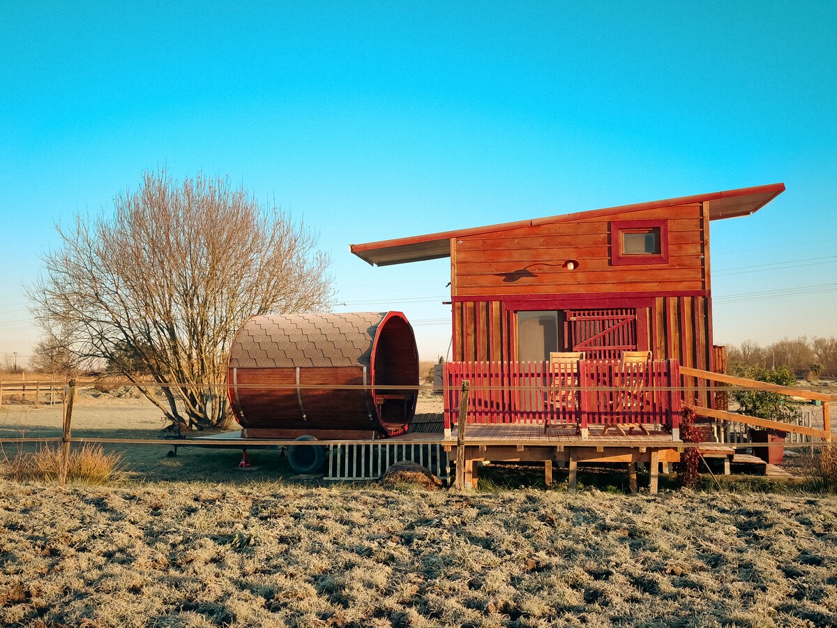 Hytta vår, midt i vingårdene med badstue og privat jacuzzi, består av en stor stue med fullt utstyrt kjøkken (Nescafé kaffemaskin og kaffekapsler inkludert), en sovesofa, et bad og et stort soverom med en seng på 160 × 200. Du kan også nyte en stor terrasse med utsikt over vingården. En bioklimatisk pergola lar deg slappe av i boblebadet året rundt. En tønnebadstue er også tilgjengelig. på terrassen.