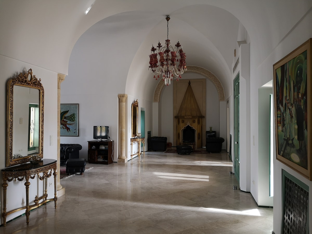 Stor villa S5 innredet i en elegant tunisisk stil som blander lokal sjarm og autentisitet. Perfekt for å slappe av i elegante og beroligende omgivelser, veldig nærme de vakreste reisemålene i de nordlige forstedene til Tunis. • Stor hage med bordtennisbord. • stort privat svømmebasseng, ikke oversett, solfylt • Trådløst nettverk, klimaanlegg, peis og fullt utstyrt kjøkken. • Beliggende i et rolig og trygt nabolag. • 12–19 minutter til Carthage, Sidi Bou Said og La Marsa. • Parkering er tilgjengelig.