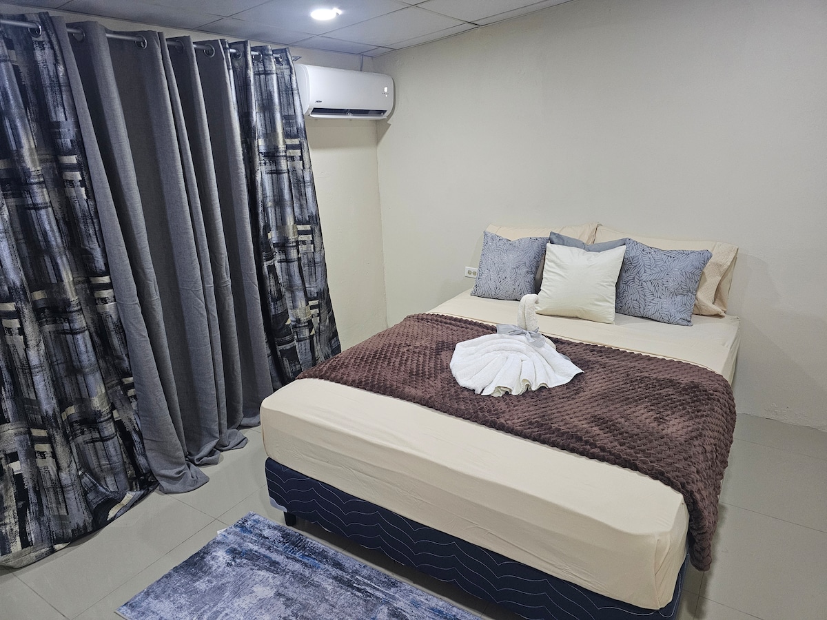 Leiligheten ligger ca. seks minutter med bil til flyplassen. Enheten inkluderer: Elektrisk vannkoker. Brødrister Gryter og panner, servise og bestikk. Smørbrødmaskin. Én queensize-seng. Sofaseng Ett bad Walk-in-garderobe. Parkering for ett kjøretøy. klimaanlegg Elektronisk port. overvåkningskameraer Trådløst nettverk Varmt/kaldt vann TV Komfyr Kjøleskap Mikrobølgeovn Vaskemaskin og tørketrommel. Plassert i et rolig nabolag, i nærheten av supermarkeder, bensinstasjon, apotek, gatekjøkken, restauranter, skoler, puber, kjøpesentre, fuglereservat osv. * Røyking er ikke tillatt.