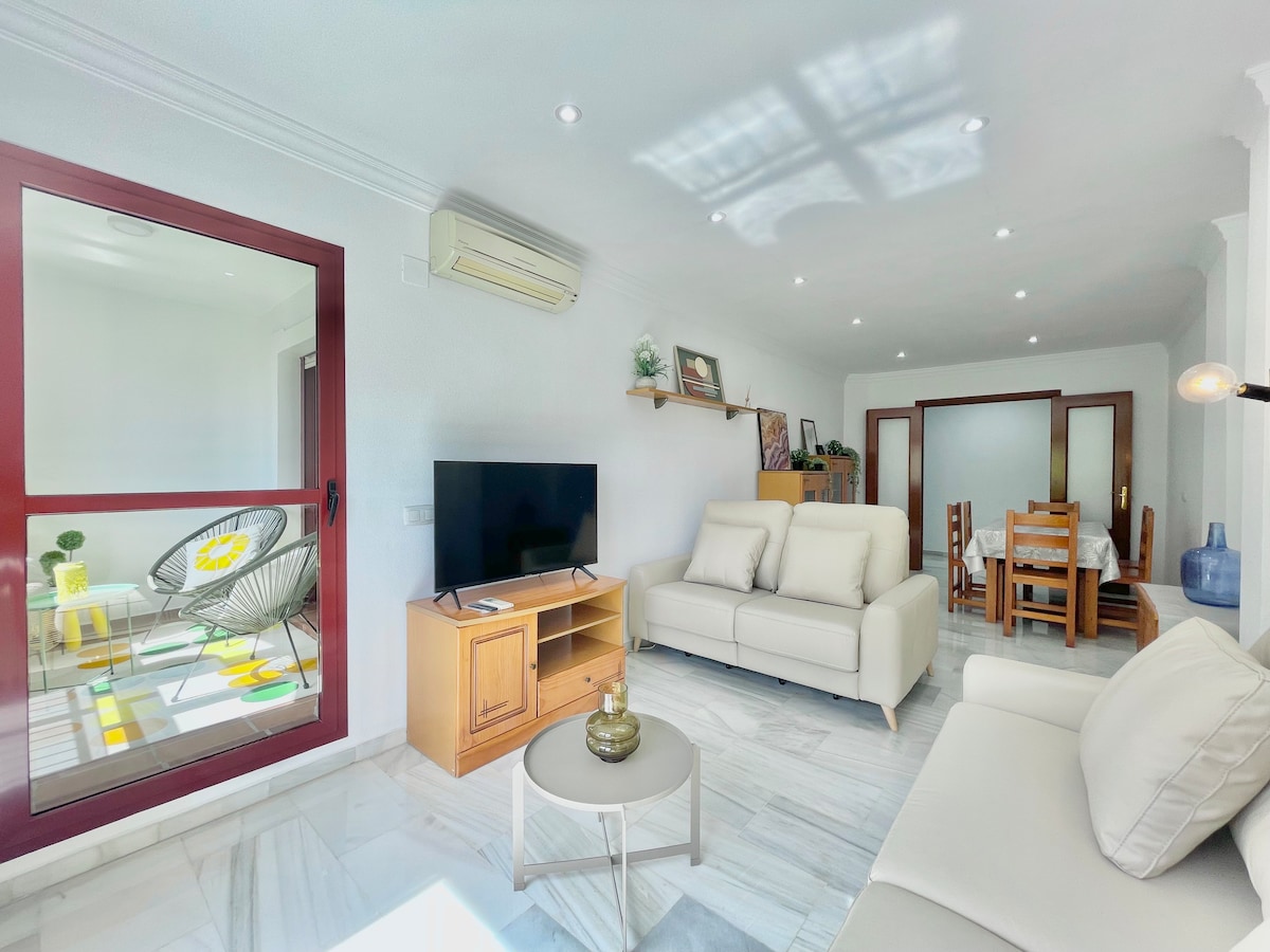 Enjoy modern furnishings and stylish decor in a peaceful yet central location. The apartment is part of a beautiful community with a reformed swimming pool and shared BBQ and seating area. You're just a short walk from everything: the beach, train, shops, restaurants, and the stunning Parque de la Paloma. Inside, you'll find all the comforts of home, including: ✓ Comfortable doublebed (160x200cm) ✓ A/C (hot & cold) ✓ High-speed WiFi ✓ Dishwasher & laundry ✓ Smart TV with satellite channels