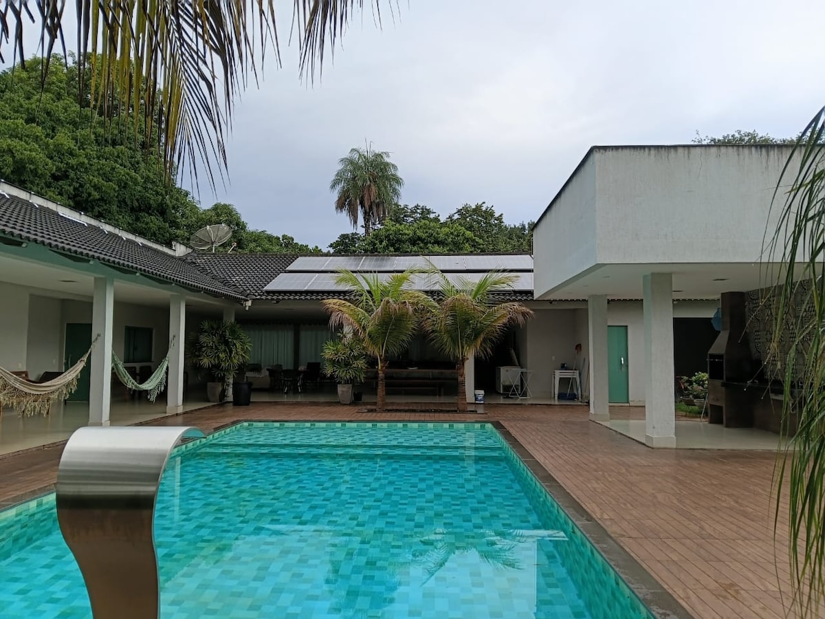 Stort hus på Aruanã. Ligger foran det nye forumet, 600 meter fra Araguaia-elven og Red River. Avstand 1 km fra torget i sentrum. Den har 4 suiter, fritidsområder, oppvarmet basseng med LED-belysning, fossefall og boblebad. Gourmetområde med grill og koketopp, mannlig og kvinnelig sosialt bad, fullt kjøkken, serviceområde med vaskemaskin og garasje for 4 biler. Trådløst nettverk i hele huset, 60"TV med abonnementskanaler. Kjæledyrvennlig hus.