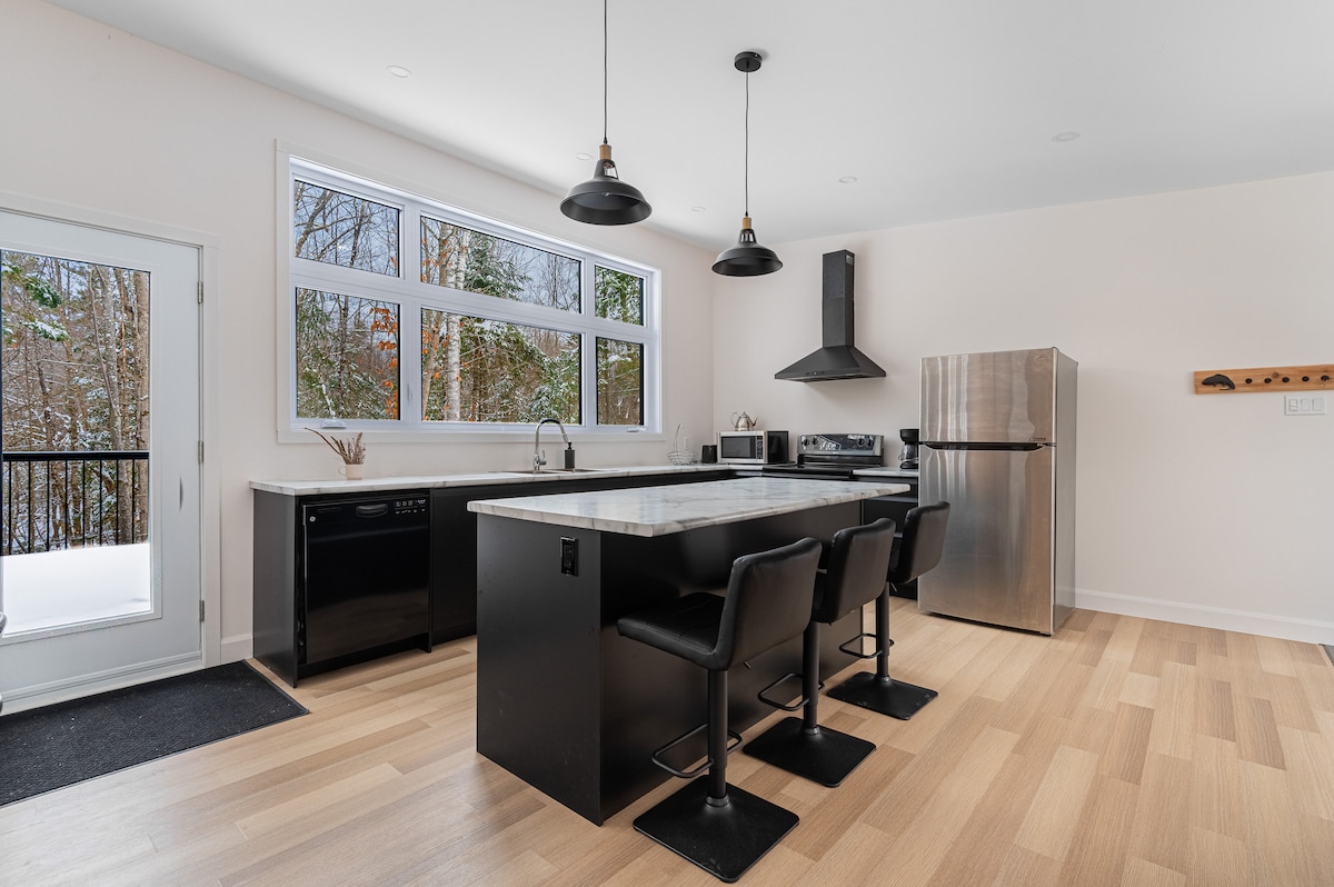 Nyt den beroligende effekten av naturen ved å bo i denne moderne alpehytten med rikelig med vinduer i hjertet av skogen. Tremblant er vakker, uansett sesong. En drømmende utendørs destinasjon, du vil være 8 minutter fra Mont Blanc og 20 minutter fra Montmblant. Enten det er for fotturer, langrenn, snøsko eller snøscooterkjøring, er stier lett tilgjengelige i alle retninger. For ikke å nevne den berømte P'tsit Train du Nord 3 minutter med bil unna.