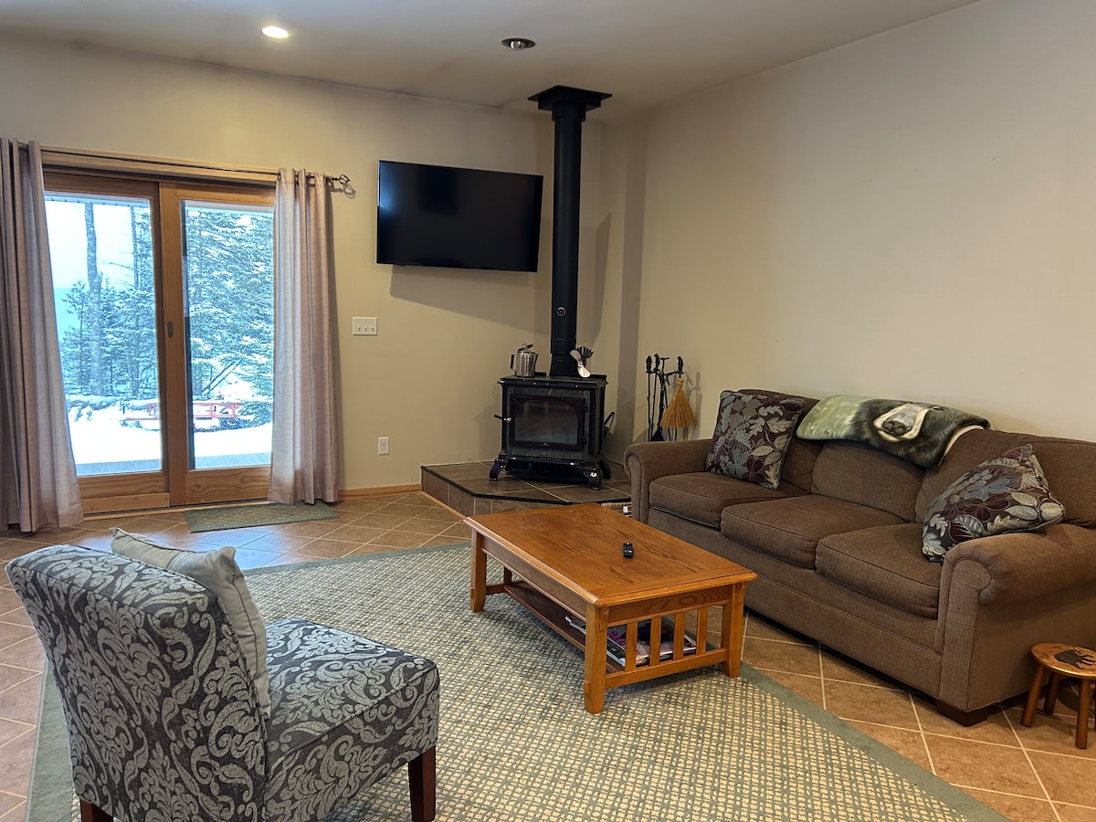 Fin, ren leilighet kun fem minutter fra Michigan Tech og utsikt over Portage Lake (tilgang til innsjøen også!). En bod med garasjeparkering er tilgjengelig slik at du kan gå rett fra bil til leilighet uten å håndtere snøen. Oppkjørselen er pløyd. Trådløst nettverk, varme og keurig kaffe er inkludert. Vaskemaskin og tørketrommel er på det romslige badet med dusj. Komplett kjøkken og elektrisk peis. Trappheis fra garasjen. Seng i queen-størrelse med ekstra sovesofa (omtrent full størrelse) og barneseng.
