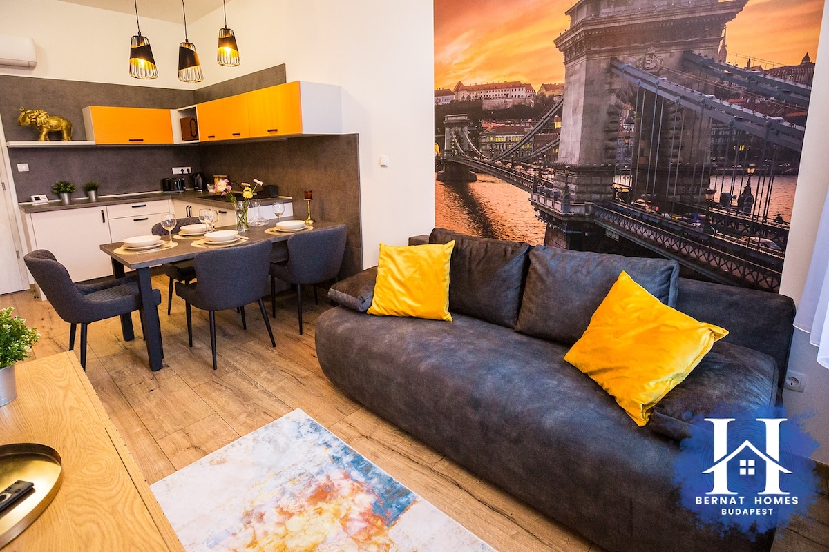 Del en kveldsdrink på den koselige terrassen og skål for byens hustak, Gellért Hill og Astoria Square. Den elegante salongen med paneler på dette solfylte stedet kombinerer en unik vegg med treplanker med en stor, slapp sofa i akvatisk farge. Vakkert designet, fullt utstyrt, helt ny to-roms leilighet i en spennende art deco-bygning i super sentrumsområdet, i nærheten av Astoria-torget. Leiligheten har en stor stue med spiseplass og fullt utstyrt kjøkken. Stue med trådløst nettverk, Bluetooth-høyttaler, kabel-TV og alt du trenger. Dette unike stedet tilbys for par, venner og familier. Med to soverom (maks. fire personer), to dusjer og tre toaletter. Eiendommen har aircondition. Gjestene våre kan bruke hele leiligheten (90 kvm). Vi og/eller vertinnen er tilgjengelige under hele oppholdet ditt. Ta kontakt med meg. Leiligheten ligger i en Art Deco-bygning i nærheten av Astoria, noen skritt fra Donau, sentrum, ruinpuber og de beste barene og restaurantene. Metrolinje 2 ligger tre minutters gange fra bygningen. T-banelinje 2 ligger tre minutters gange unna (Astoria), T-banelinjene 1 og 3 ligger også innenfor fem minutters gange.