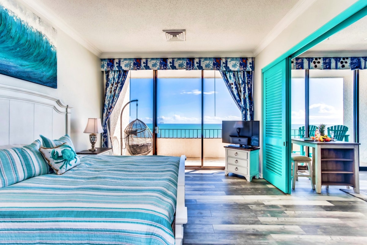 Direct Oceanfront Balcony Unit 16th floor. Må være 23år eller eldre for å leie per HUSEIERFORENING. Ny reno nøkkelfri inngang. Enhet med king-size-seng med plass til 6. 2 strandstoler og paraply for gjestenes bruk. Mulighet for kingsize-dobbeltseng og futon (barn), dobbel Murphy og sovesofa, oppgraderte madrasser. Apparater i full størrelse. PoolsideTiki-bar, restauranter, innendørs/utendørs late elver, boblebad, bassenger, barnebassenger og vannfunksjoner. Gratis parkering, internett, brannpinne og mulighet til å logge inn på strømmetjeneste tilgjengelig.