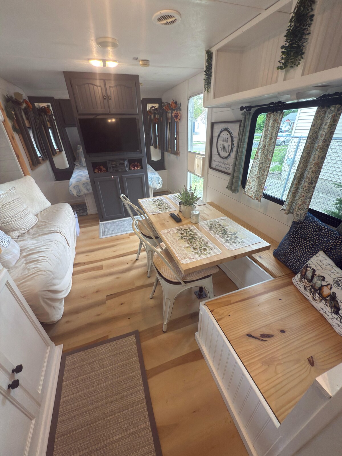 Fullt renovert campingvogn, designet i moderne gårdshus sjarm, leveres til din valgte campingplass innenfor en radius på 100 miles! Nyt hvite skap, en spisestue som går rundt, utfoldbar sovesofa, queen-seng, fire køyesenger, fullt bad, klimaanlegg, varmeapparat og utendørs komfyr. Slapp av med to flatskjerm-TV-er eller filmkvelder utendørs med en projektor og et telt med lerret. Fasiliteter: dobbeltseng, 4 køyesenger, sovesofa, fullt bad, klimaanlegg, varmeapparat, 2 TV-er, projektor, 100 tommers skjerm, telt med skjerm og en utendørs komfyr.