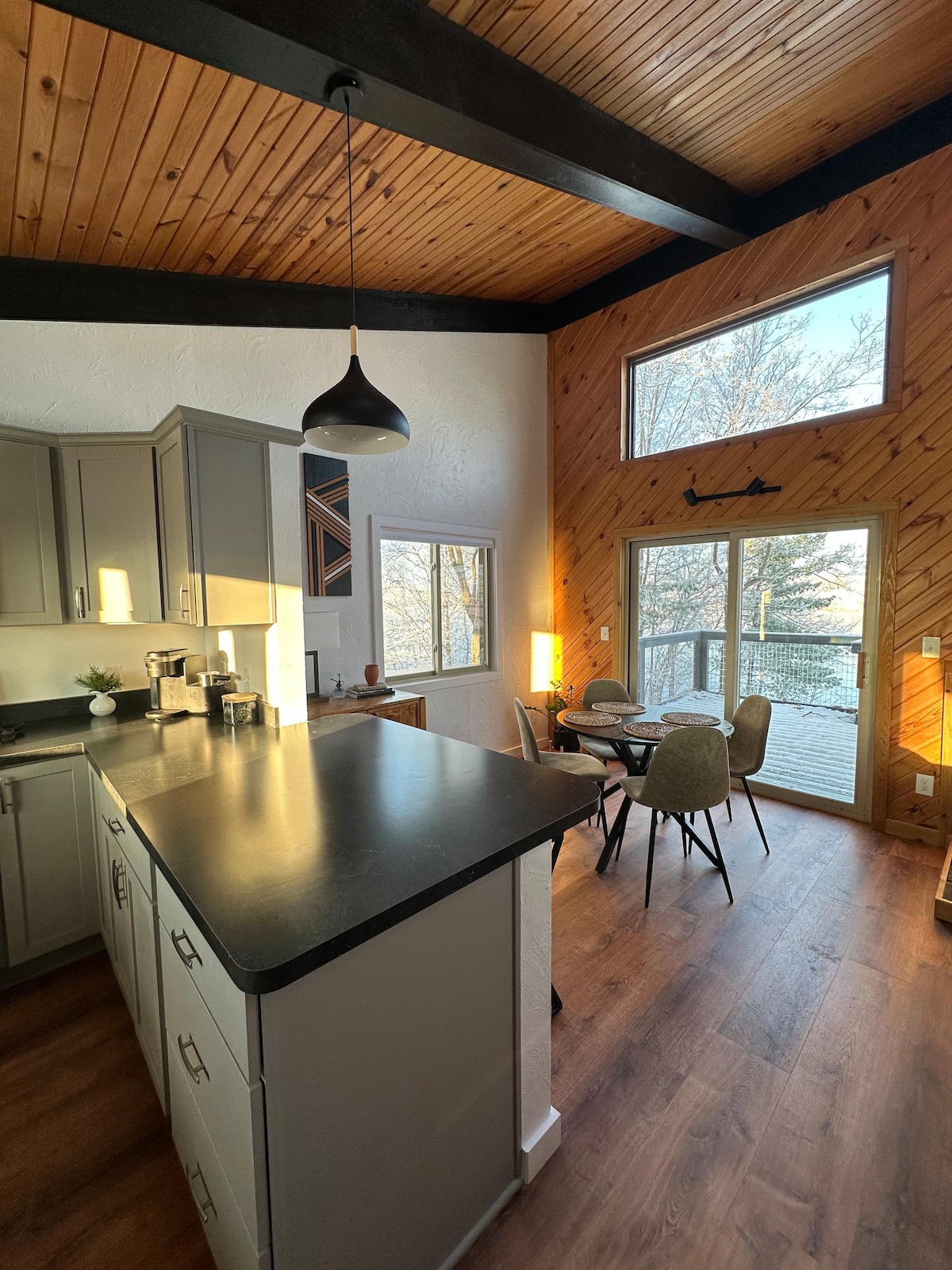 Reis til ditt eget private tilfluktssted ved innsjøen. Dette koselige, rustikke og moderne lille hjemmet ligger noen skritt fra en 18 hektar stor innsjø med kildevann, sandstrand, kajakker, flott fisking og fredelig utsikt over vannet. Slapp av i boblebadet ved solnedgang eller slapp av på terrassen omgitt av natur. På innsiden finner du en hevet seng, kjøkkenkrok, fullt bad med dusj, vaskemaskin/tørketrommel og alt du trenger for et komfortabelt opphold. Perfekt for par eller enslige gjester som ønsker å koble fra og lade opp.