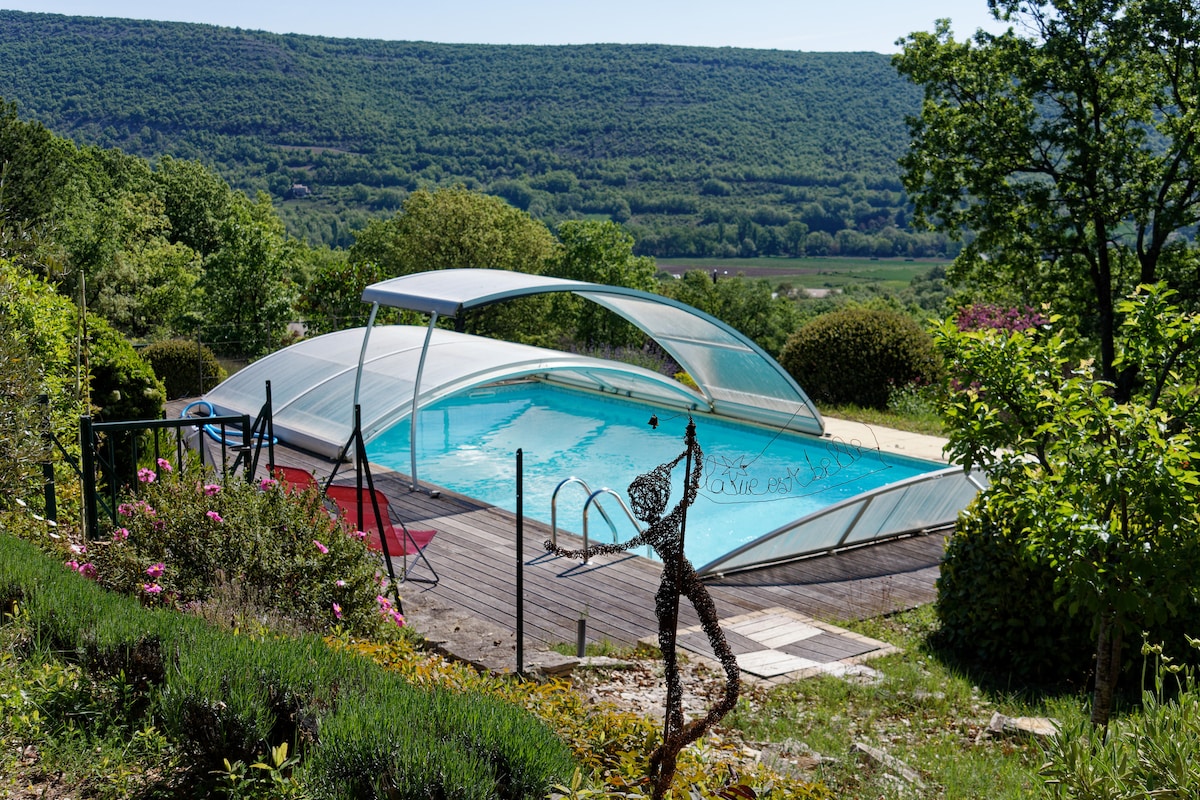 Oppdag en oppslukende glasshytte, som ligger i hjertet av Luberon, for et tidløst øyeblikk. Lyset passerer gjennom buktvinduene, naturen omgir deg og solnedgangen er synlig hver kveld fra sengen din. 🌿 Stedet ditt: • kingsize-seng med utsikt • Designer walk-in-dusj i travertin • Hengende katamaran-nett for å slappe av. • Privat nordisk bad, kun for deg! • 25 m steinbasseng Her er alt designet for å roe ned, puste, nyte