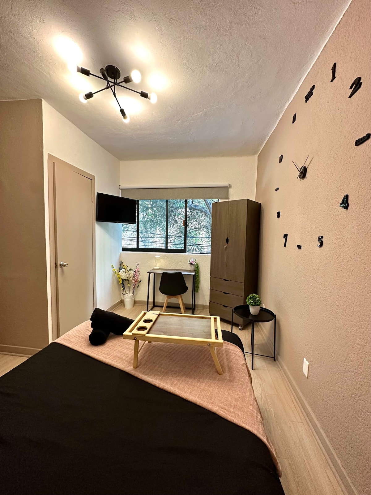 Koselig studio i en av byens topp beliggenhet: sentrum Polanco Leiligheten ligger i nærheten av parker, restauranter og museer, samt uslåelig tilgang til transportalternativer, inkludert metro og sykkel. Koselig og solrik studioleilighet i et av de beste stedene i Mexico City: Polanco. Leiligheten ligger like ved parker, restauranter og museer, samt mange transportmuligheter, inkludert en T-banestasjon og sykkelutleie.