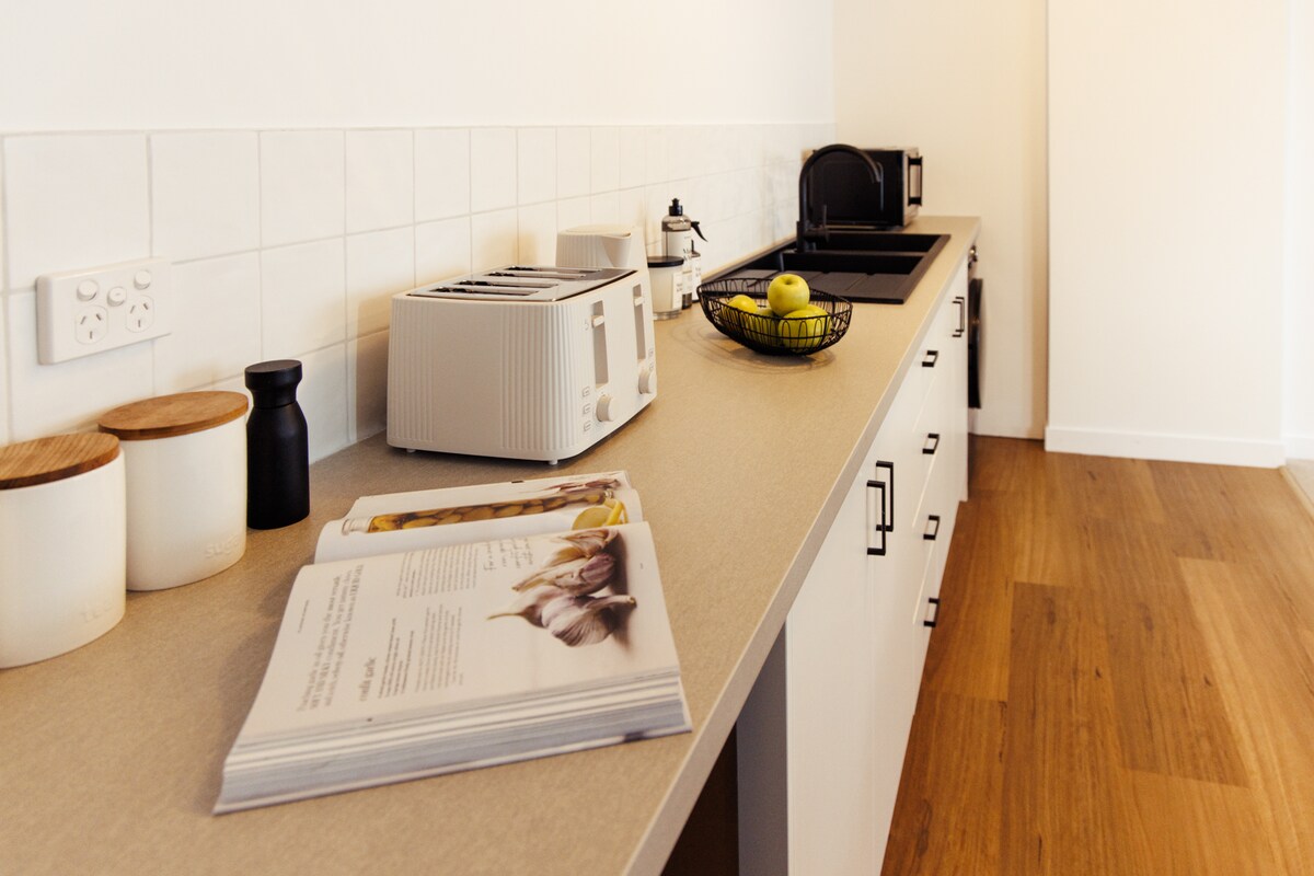 Designed by 1 + 2 Architects and built by VOS our home won a HIA award in 2005. Part of our brief to the architects was to design a part of the home where our guests could have complete privacy and feel spoilt . It has become a sanctuary for many people . Recently our local renowned Interior Designer has visited the apartment . The result is spectacular and calming . Quality furniture is enhanced by soft furnishings from Adairs. Professionally laundered bed linen adds to the sense of luxury.