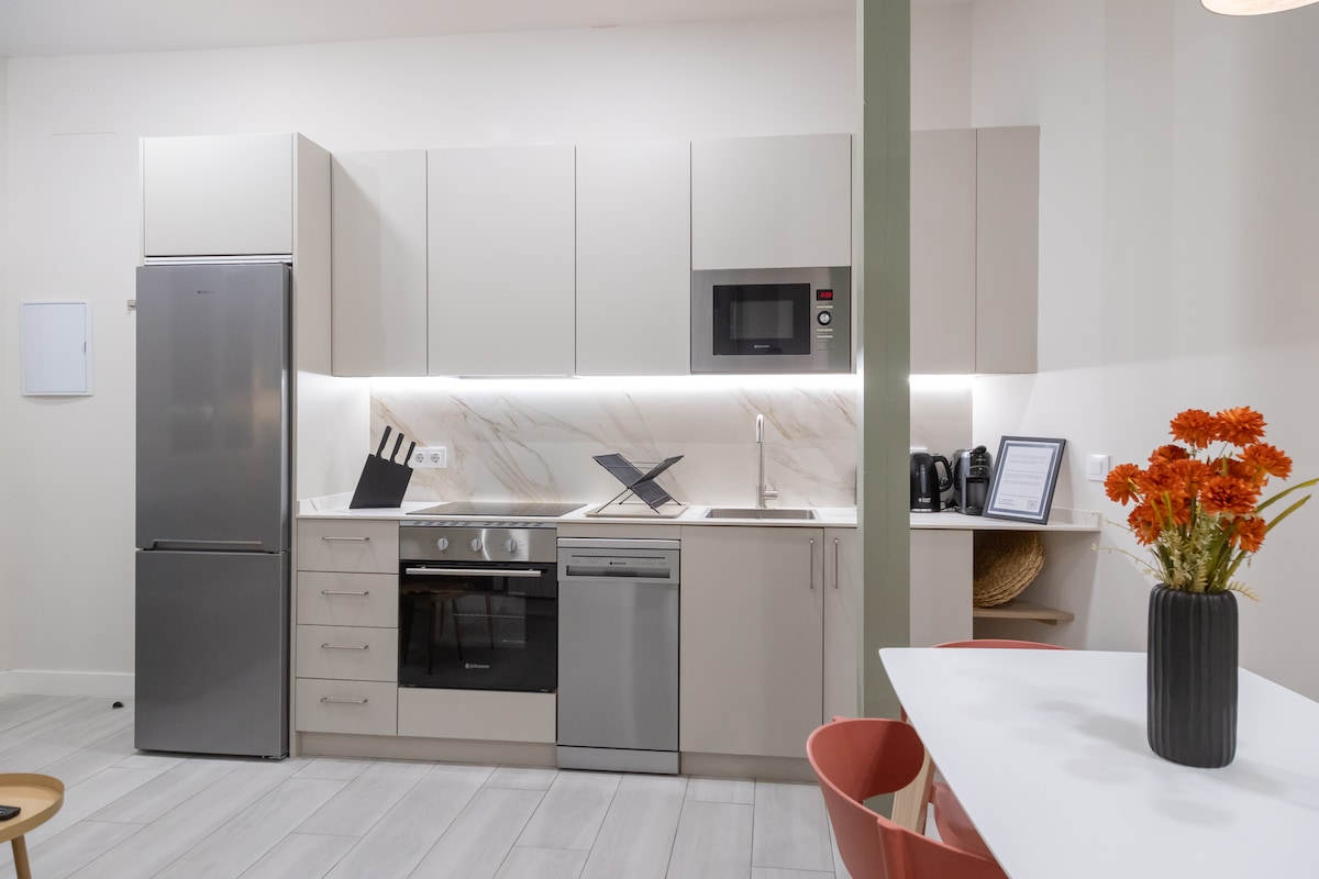 Magnificent 45 square meter apartment in the heart of Madrid. With spectacular design and decoration, spacious areas, and high ceilings, the apartment is equipped with everything you need for your stay in Madrid. The living room has three balconies overlooking the street that provide great brightness to the flat. The bedroom has an en-suite bathroom and a work desk. From the apartment, you can walk to almost all the iconic points of Madrid.