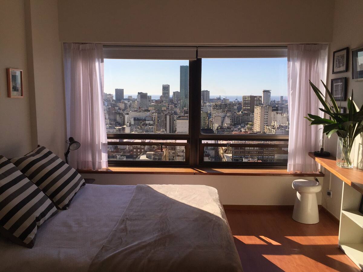 Slapp av 27 etasjer over de travle gatene i sentrum av Buenos Aires i denne koselige, velutstyrte studioleiligheten. Denne studioleiligheten har dobbeltseng, tekjøkken og bad med badekar. Hovedrommet er 3,35 x 5 meter, ikke inkludert badet og inngangen. Bygningen har sikkerhet døgnet rundt. Perfekt beliggenhet for å utforske byen. To kvartaler fra obelisken, fire fra Teatro Colón og åtte fra det berømte Casa Rosada (Pink House). Ved tre T-banelinjer og åtte busslinjer.