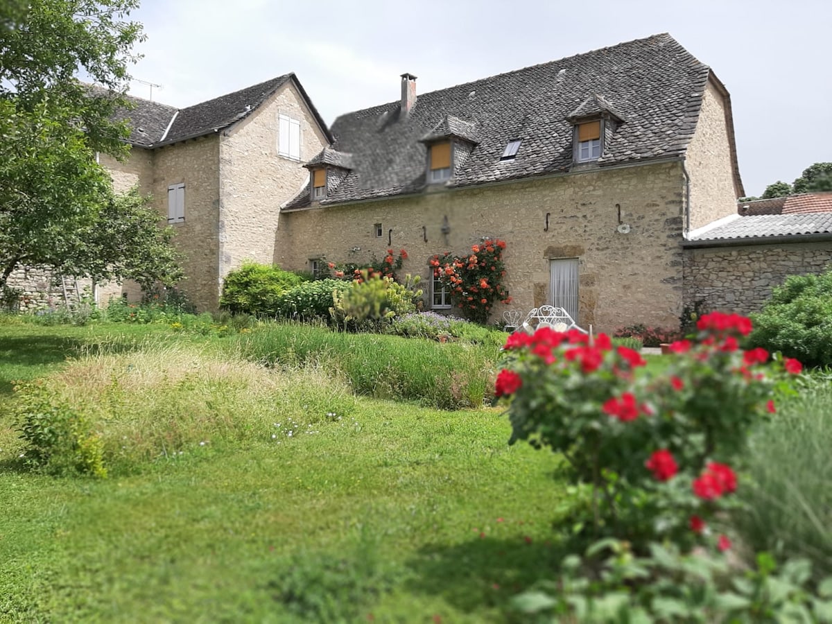 Halvveis mellom Villefranche de Rouergue og Rodez, restaurert låve med respekt for den gamle bygningen, ro og fred i grønne omgivelser, deling og oppdagelse av den autentiske landlige verden: topo-guider, spaserturer, typiske landsbyer, ... soverom under tak med 1 bad, 1 stue med peis, terrasse og blomsterte hager