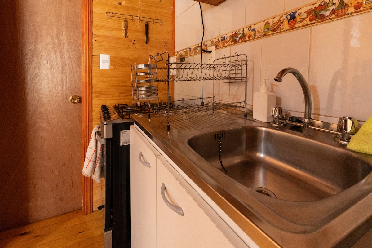 Slapp av i denne koselige leiligheten som er designet for hvile. Den har en komfortabel dobbeltseng og en varm atmosfære, perfekt for én eller to personer. Nyt roen i sør, samtidig som du er bare noen skritt fra den mytiske Carretera Austral. Vi ser frem til å se deg!