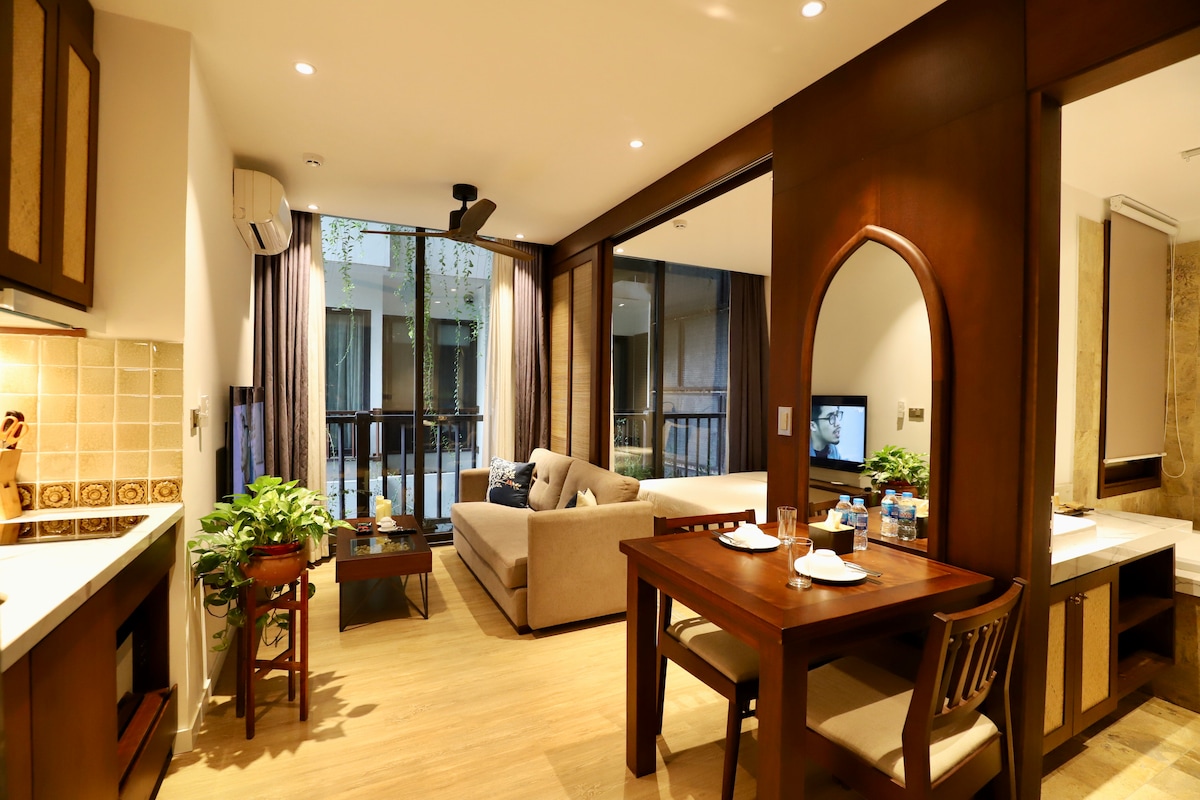 Bare noen få skritt unna det gamle kvarteret, krysser den rolige gangen i en harmoni av trerammer, greener, svømmekoi og opp til denne kultiverte, kompakte leiligheten. Med en glassvegg klar, la det myke dagslyset skinne gjennom. På et så kompakt sted bør alle detaljer være hensynsfulle, moderne og optimalisert for et komfortabelt opphold. Belysning håndplukket av sjefen for å bringe hygge, indokinerte dekorer og andre vignetter i mørke tretoner for å føle seg perfekt .