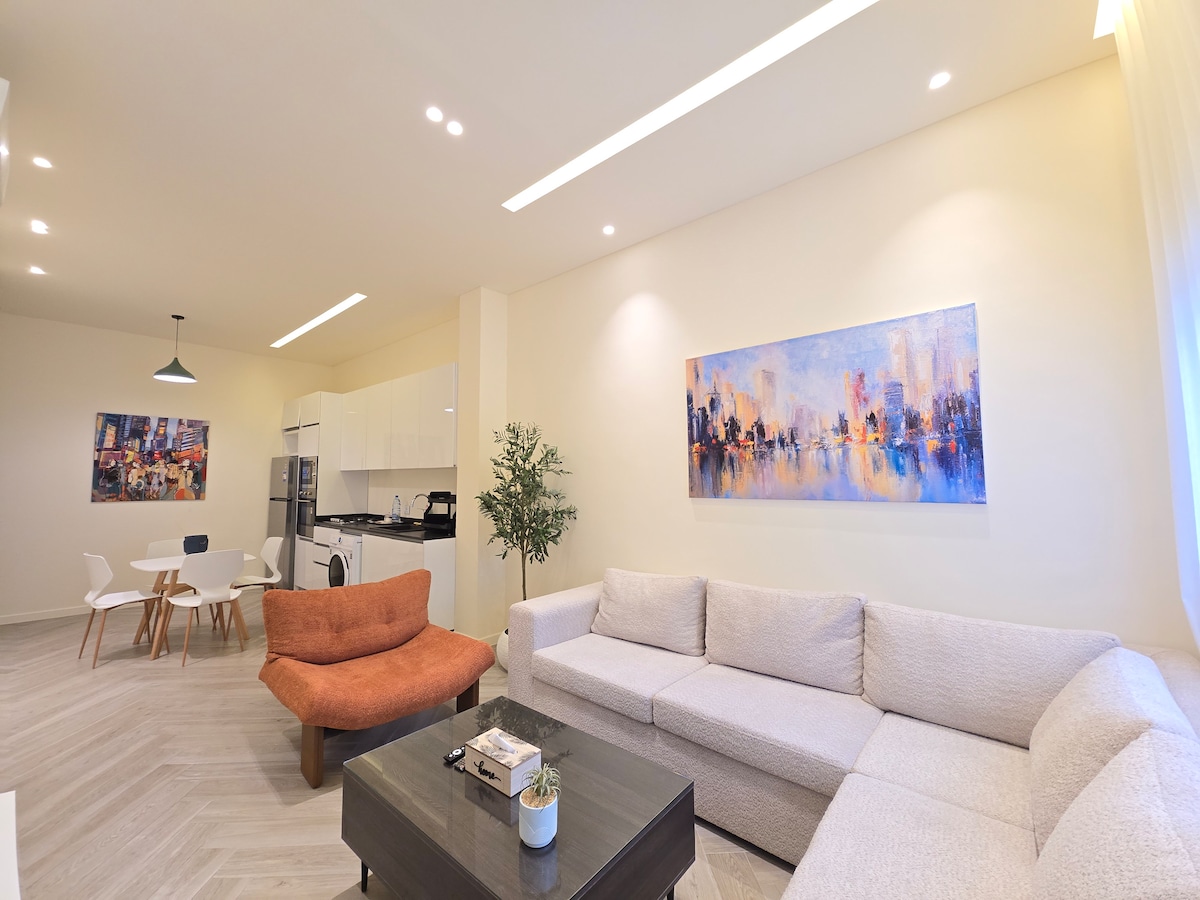 Opplev ro i leiligheten vår med ett soverom i Rawda/Metn. Fasilitetene inkluderer et soverom med queensize-seng, en komfortabel stue med 43-tommers smart-TV, et utstyrt åpent kjøkken, en privat utendørsterrase og et komplett bad med badekar. Nyt strøm døgnet rundt, øyeblikkelig varmt vann, gratis trådløst nettverk og klimaanlegg for avkjøling/oppvarming i alle rom. Eksklusivt: sikker, privat parkering for opptil tre biler! Sentralt plassert for enkel tilgang til alt, men likevel fredelig og rolig.