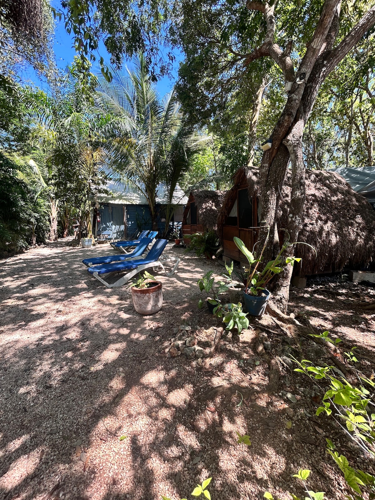 Gjestehuset vårt ligger i den tropiske hagen til Travel in'-restauranten på den karibiske kysten. Travel in' ligger utenfor allfarvei, 6 km sør for landsbyen Mahahual, Costa Maya. I samme hage finner du vår Hide Away oppført på Airbnb, med to dobbeltsenger for maks fire gjester.