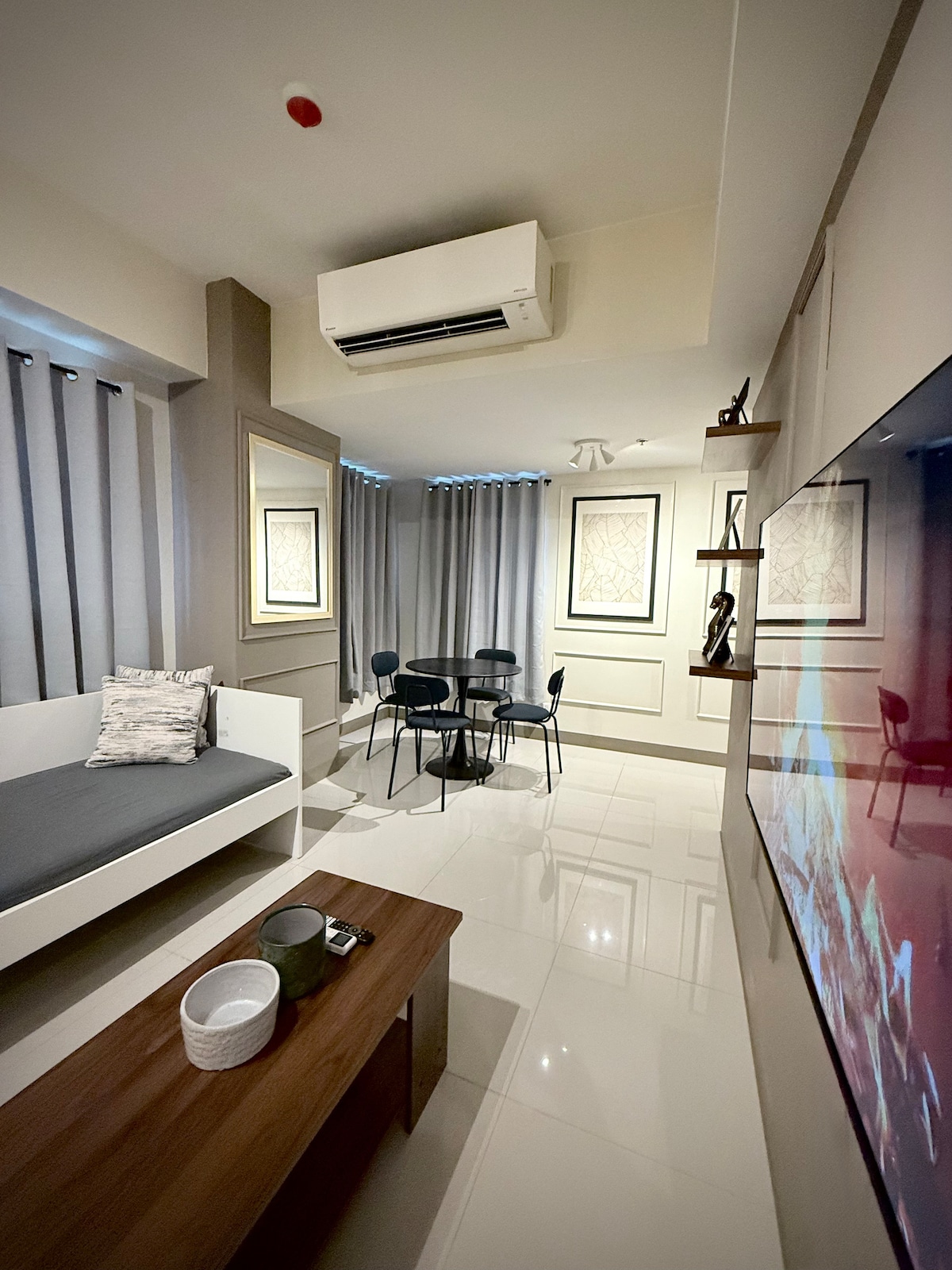 Studio i andre etasje med terrasse over bassenget, Executive Internett-pakke, 55" Samsung Smart 4K-TV, fullt utstyrt kjøkken med nytt kjøkkenutstyr, redskaper og bestikk. Ny kaffetrakter, mikrobølgeovn. En røykfri enhet med balkong med utsikt over bassengområdet. La Grande Residence har blitt det fremste valget for både forretningsreisende og turister som besøker Clark Freeport og Pampanga-området. Len deg tilbake og slapp av på dette rolige, elegante stedet.