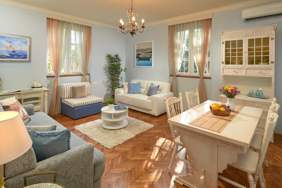 Denne unike og sentrale leiligheten ligger i et gammelt familiehus i stein bygget i 1905, totalrenovert i 2018. Huset har en ideell beliggenhet mellom det gamle sentrum med UNESCO-beskyttet Diokletians palass og den mest berømte stranden i byen – Bačvice-stranden, slik at du kan nå hver av disse attraksjonene på fem minutter til fots. Tog- og busstasjonen, samt fergehavnen, kan nås på mindre enn ti minutter til fots. Du trenger ikke å bruke bil mens du bor hos oss.