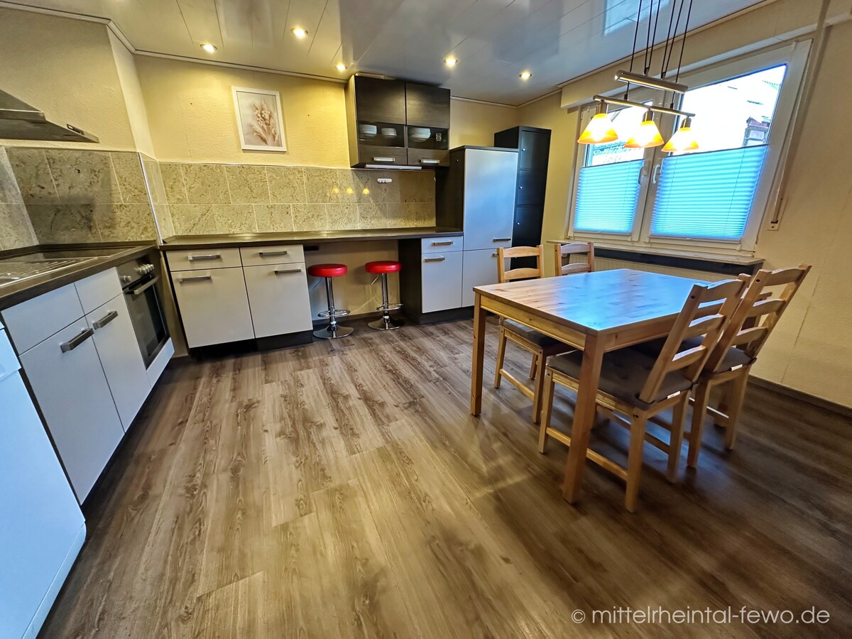 Herzlich Willkommen am Fuße der Loreley, direkt am Rhein! Siebzig Quadratmeter zum Wohlfühlen, Entspannen und Genießen! In einem Haus von 1900 wurde diese Wohnung neu renoviert, sowie liebevoll und modern eingerichtet. Über den angrenzenden Balkon besteht ein direkter Blick auf den Rhein, die Burg Maus und die Burg Rheinfels. Die Küche, sowie das Bad und Gäste-WC sind voll ausgestattet. Im Wohnzimmer befindet sich neben einer Schlafcouch auch ein Smart-TV.