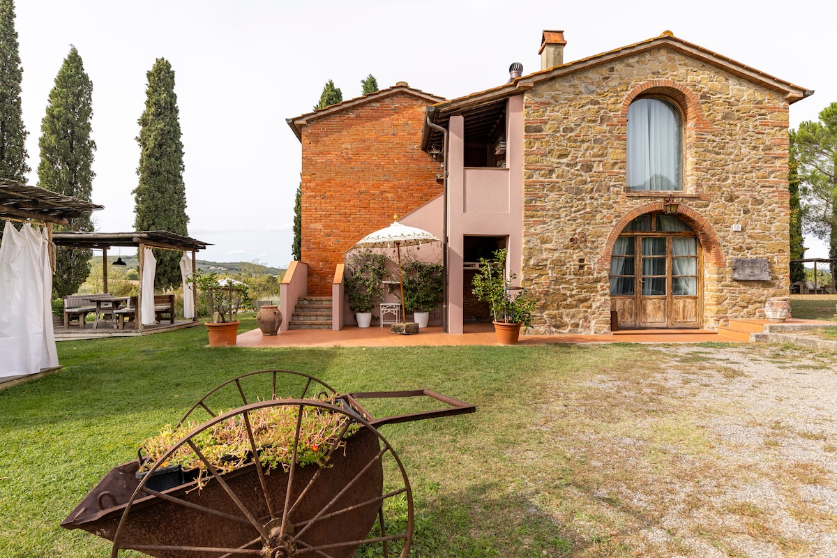 Føl deg i nærheten av landet i en rustikk bygning på en toskansk gård. Gamle steinvegger, tak med utsatte bjelker og terrakottagulv er bakteppet til en karakteristisk leilighet med peis. Dykk ned i et evighetsbasseng for en unik utsikt over det omkringliggende landskapet. Spis utendørs, med den friske luften som kjærtegner deg, sitt og nyt solnedgangen under de gamle sypresser.