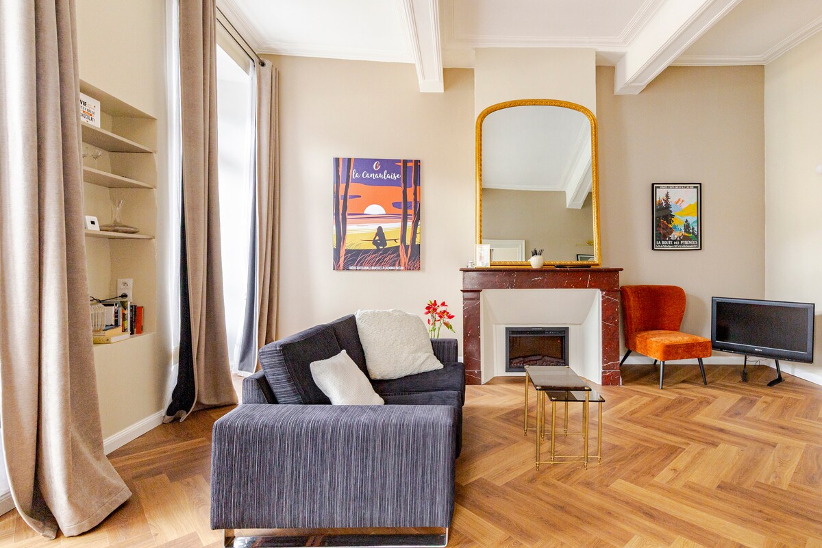 Elegant duplex renovert av en dekoratør, forbundet med heis. Med utsikt over Grands Thermes, i hjertet av Bagnères-de-Bigorre, skiller silhuetten av en bygning seg ut. Denne bygningen, «Les Bains de Maria Luz», har fått et nytt liv siden den ble fullstendig rehabilitert og pusset opp i 2025. I nærheten av markedet og alle butikkene i Bagnères sentrum, er bygningen lett gjenkjennelig takket være laksfargede fasaden med grønne skodder, med utsikt over Place des Thermes.
