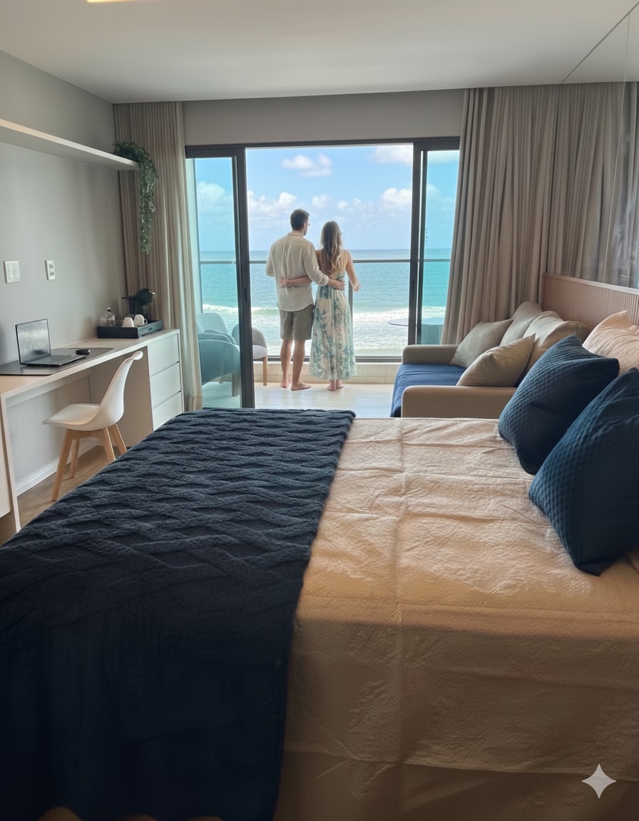 Uma das mais deslumbrantes unidades do Spot Barra, acomoda até 2 pessoas com conforto. Com vista mar, sendo a melhor posição para o Carnaval e com uma excelente vista de toda a Avenida Oceânica até o Farol da Barra. Prédio moderno com piscina, academia, Seven Wonders Restaurante no térreo que serve um delicioso e disputado café da manhã (pago), minimercado, recepção 24h e arquitetura deslumbrante. Ideal para quem busca sofisticação, vista incrível e fácil acesso às melhores atrações de Salvador.