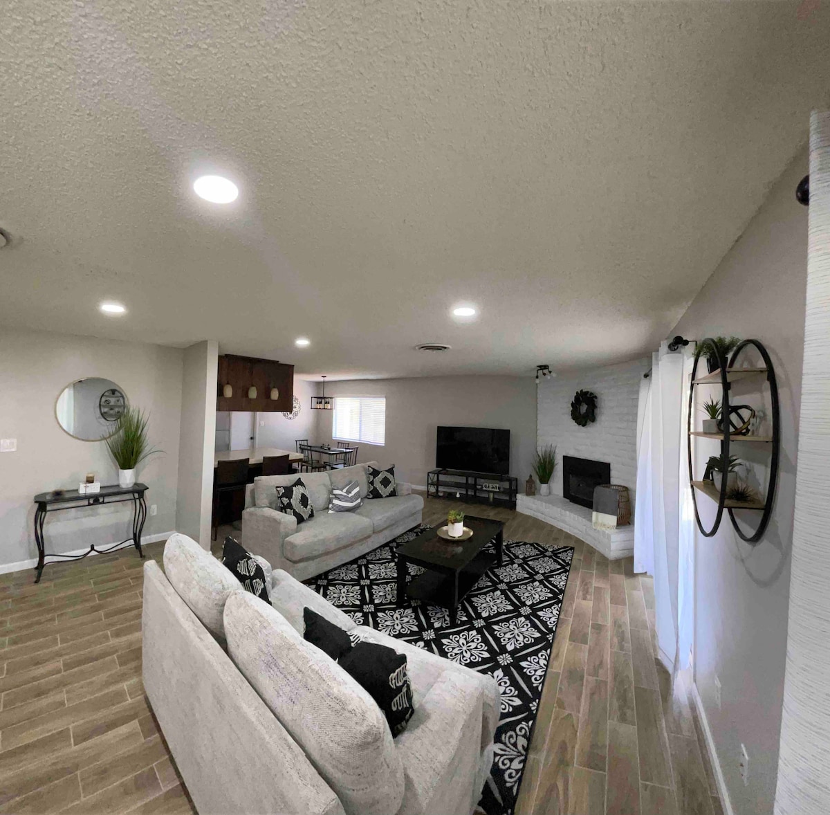 Nyt et stilig opphold i dette nyrenoverte og sentralt beliggende hjemmet med to soverom i sentrum av Bakersfield. Dette vakre huset har et nydelig, fullt utstyrt åpent kjøkken, de nyeste apparatene i rustfritt stål, takvifte, stor vask og moderne møbler fra midten av århundret. Badet er fullt utstyrt for dine favorittbehov for egenpleie, enten du vil ligge i badekaret eller dusje. Enten det er forretninger eller fritid, har dette fantastiske stedet alt du trenger!