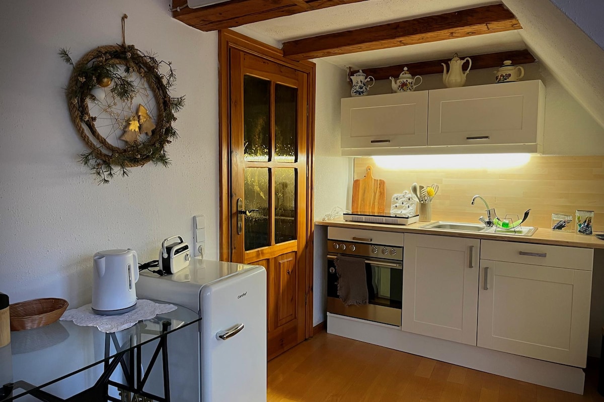 Denne vakre leiligheten med loftsaktig karakter gir en nesten 360-graders utsikt over takene i Schlossberg. I sentrum av stuen er det en vakker peis med en sidevisningshjørne og en koselig sofa med utsikt over den flimrende peisen. I inngangspartiet, ved siden av det dagslysbadet med dusj, er det en liten kjøkkenkrok med spiseplass for morgenfrokost, inkludert utsikt over gamlebyen i Quedlinburg.