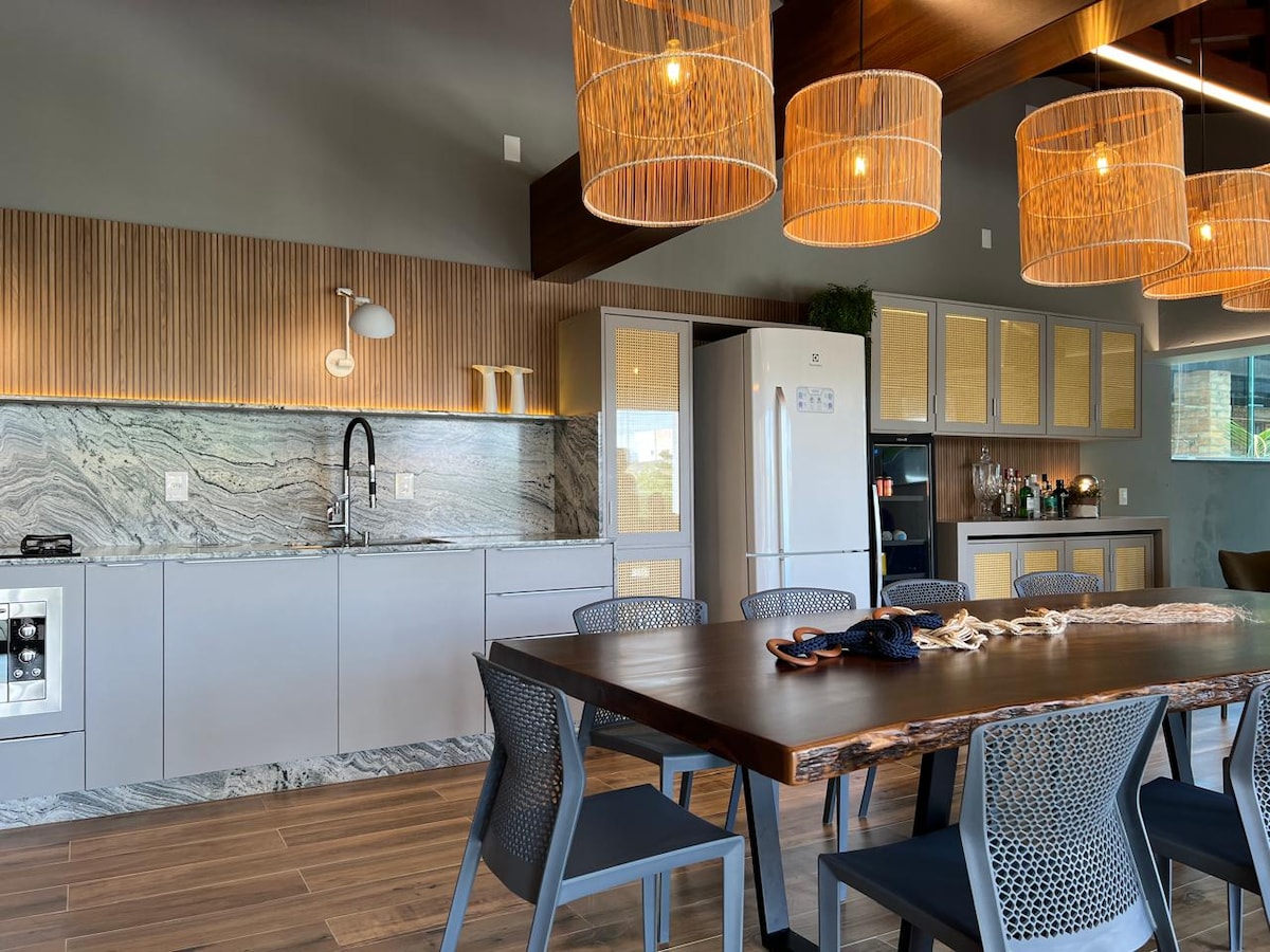 Hus ved vannet – komfort og ro for dine beste øyeblikk. Huset vårt ligger i nabolaget Salinas, et eksklusivt område i Barra do Sul, og tilbyr den perfekte rammen for å nyte uforglemmelige dager med familie og venner. Det er seks soverom, pluss en stor stue og kjøkken med utsikt over havet, noe som gir en komplett opplevelse og kontakt med naturen. Alle rommene har klimaanlegg, trådløst nettverk og et komplett grillområde, ideelt for å samle menneskene du er glad i.