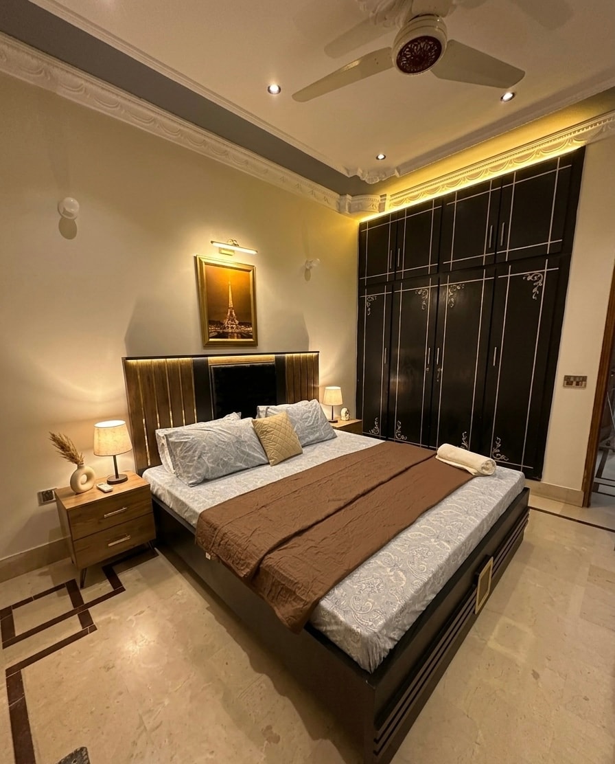 2 Bedroom apartment in safe, clean, family-friendly environment. Both bedrooms have air conditioning. Lounge with 55” LED TV and kitchen for light cooking. Ideal for families and responsible guests seeking peaceful stay. House Rules (Strict): CNIC/Passport required at check-in. Only registered guests allowed. Unmarried couples not allowed. Married couples must show CNIC with husband’s name. No drugs, alcohol, loud music or parties. Maintain cleanliness. JazakAllah Khair.