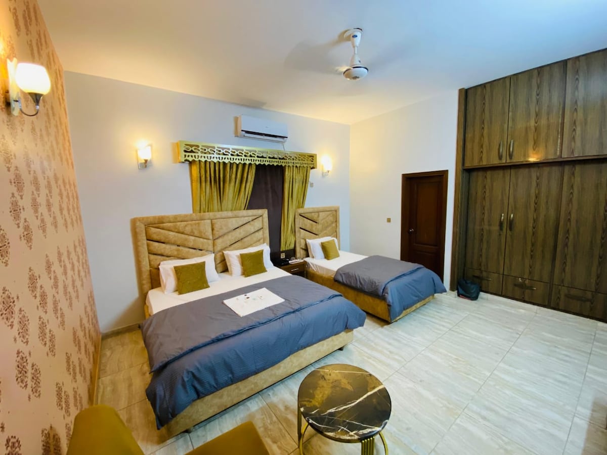 Romslig rom med dobbeltseng og enkeltseng – perfekt for små familier, venner eller jobbreisende. Nyt komfort, privatliv og sikkerhet på en sentral beliggenhet. 🔹 🛏️ 1 dobbeltseng + 1 enkeltseng 🔹 🚿 Eget tilstøtende bad 🔹 ❄️ Kjølig klimaanlegg + raskt trådløst nettverk 🔹 📍 Sentral og sikker beliggenhet 🔹 👨👩👧 Ideelt for 2–3 gjester
