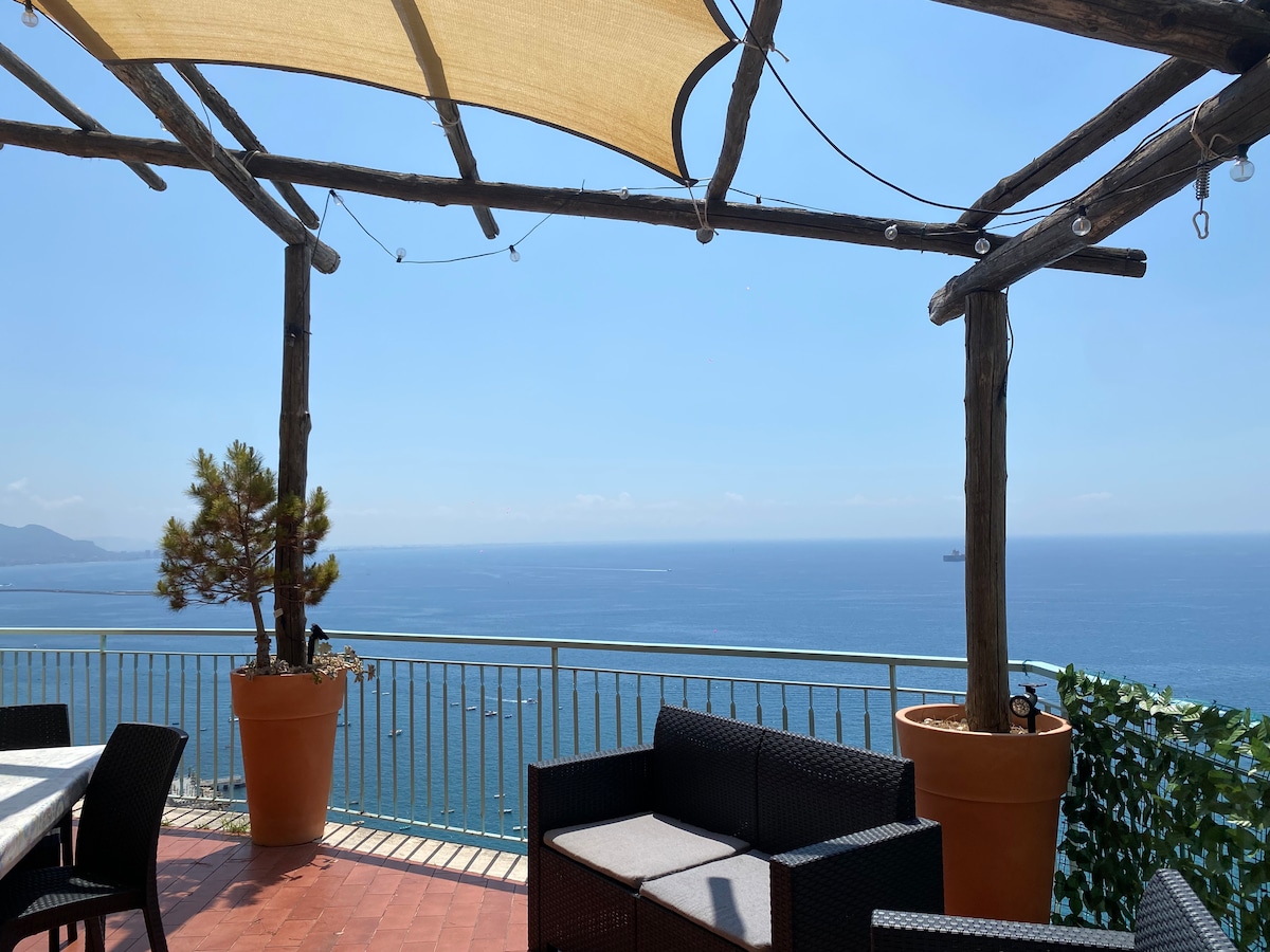 Appartamento in Villa Emilia con vista panoramica sul golfo di Salerno. Ingresso adatto per persone con disabilità motoria. L'auto può essere parcheggiata internamente alla villa. Cucina con 5 fuochi; due stanze da letto matrimoniali entrambi con condizionatore e bagno in camera. Ampissimo terrazzo con tenda parasole, tavolo e sedie in ferro battuto con ceramica Vietrese, sedie a sdraio, barbecue, forno a legna e doccia esterna. Ideale per bambini e anziani perchè possono vivere anche l'esterno