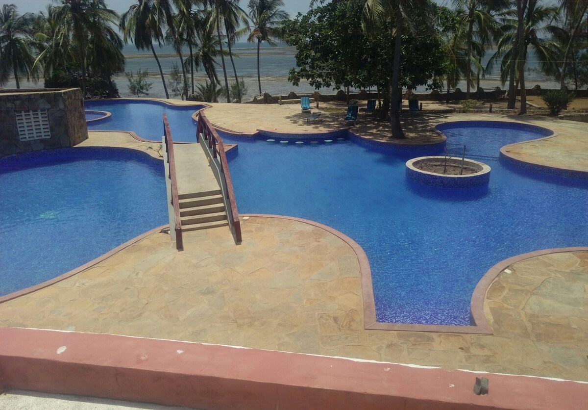 Du vil ikke glemme tiden din i dette romantiske, minneverdige stedet. Romslig hytte på en strandkompleks med et stort basseng med utsikt over havet. Har et privat badekar med jetfly å nyte inne i hytta. Kommer med Fans,A.C og stort sted som komfortabelt kan være vert for deg med partneren din,venner,familie eller tropp,opp til 6 voksne. Lykkelig,fredelig,løvrik Shanzu-forstedene garantert ro. Stor parkering med 24/7 sikkerhetsvakter. Raskt internett,Netflix ,smakfullt møblert barneseng til lommevennlig pris.
